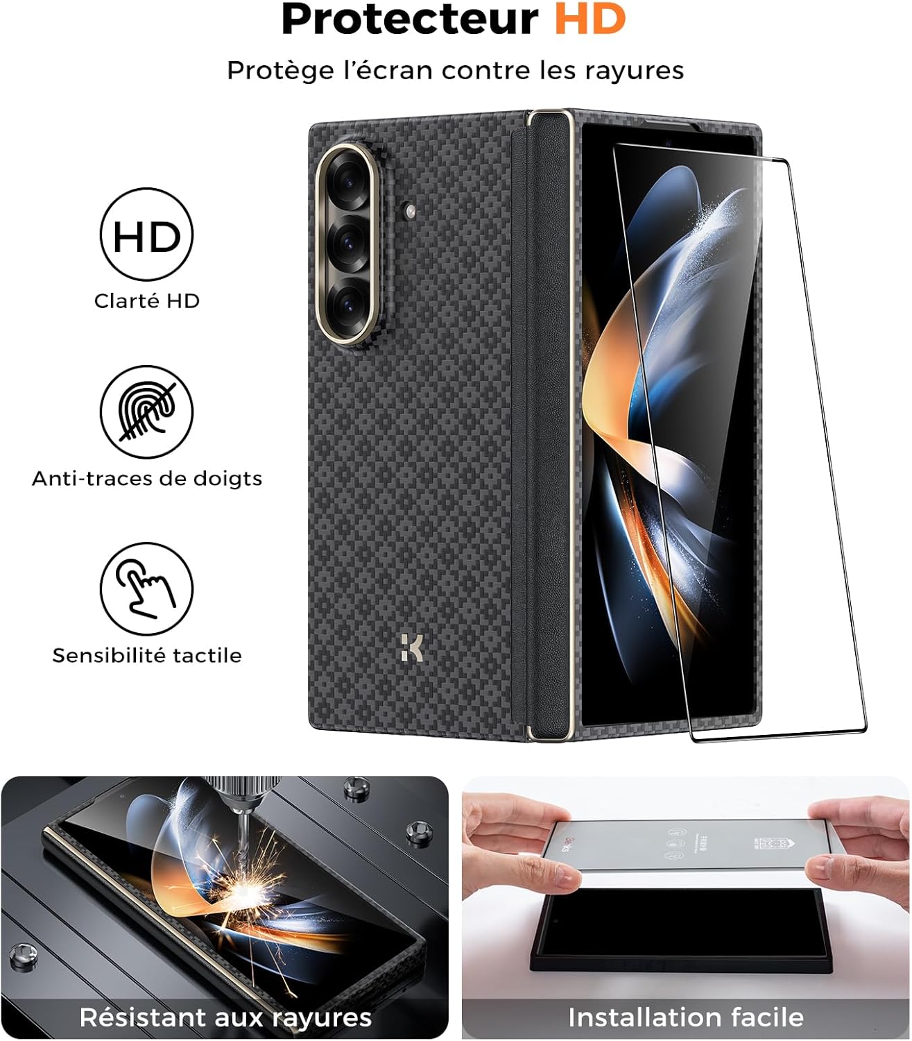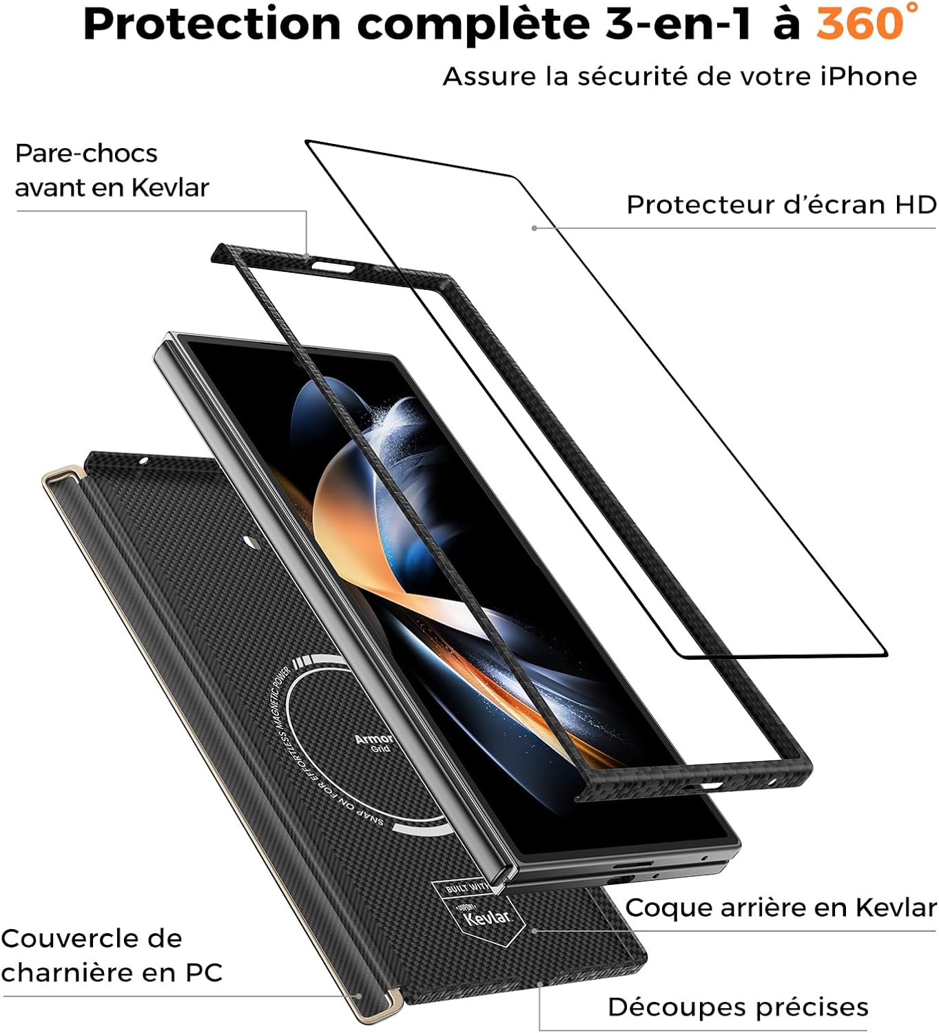 Protection à 360 ° 3-en-1: Cet ensemble de protection pour le Samsung Z Fold 7 comprend un Kevlar absorbant les chocs pour la charnière, un cadre de kevlar robuste, un protecteur d’écran ultra-fort 9H, ainsi qu’une conception surélevée autour de la caméra – pour une protection complète contre les gouttes, les rayures et les dégâts quotidiens.
