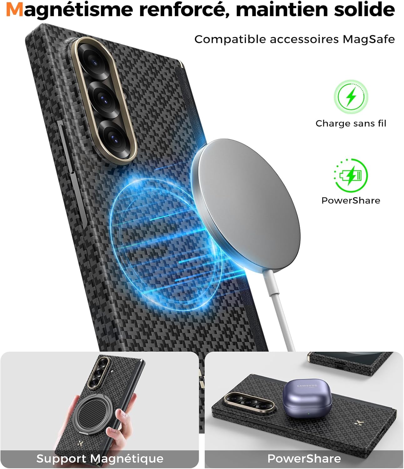 Oui, toutes nos coques pour le Samsung Galaxy Z Fold 7 sont équipées d’aimants intégrés compatibles MagSafe, permettant une fixation sécurisée avec les chargeurs sans fil et les accessoires MagSafe.