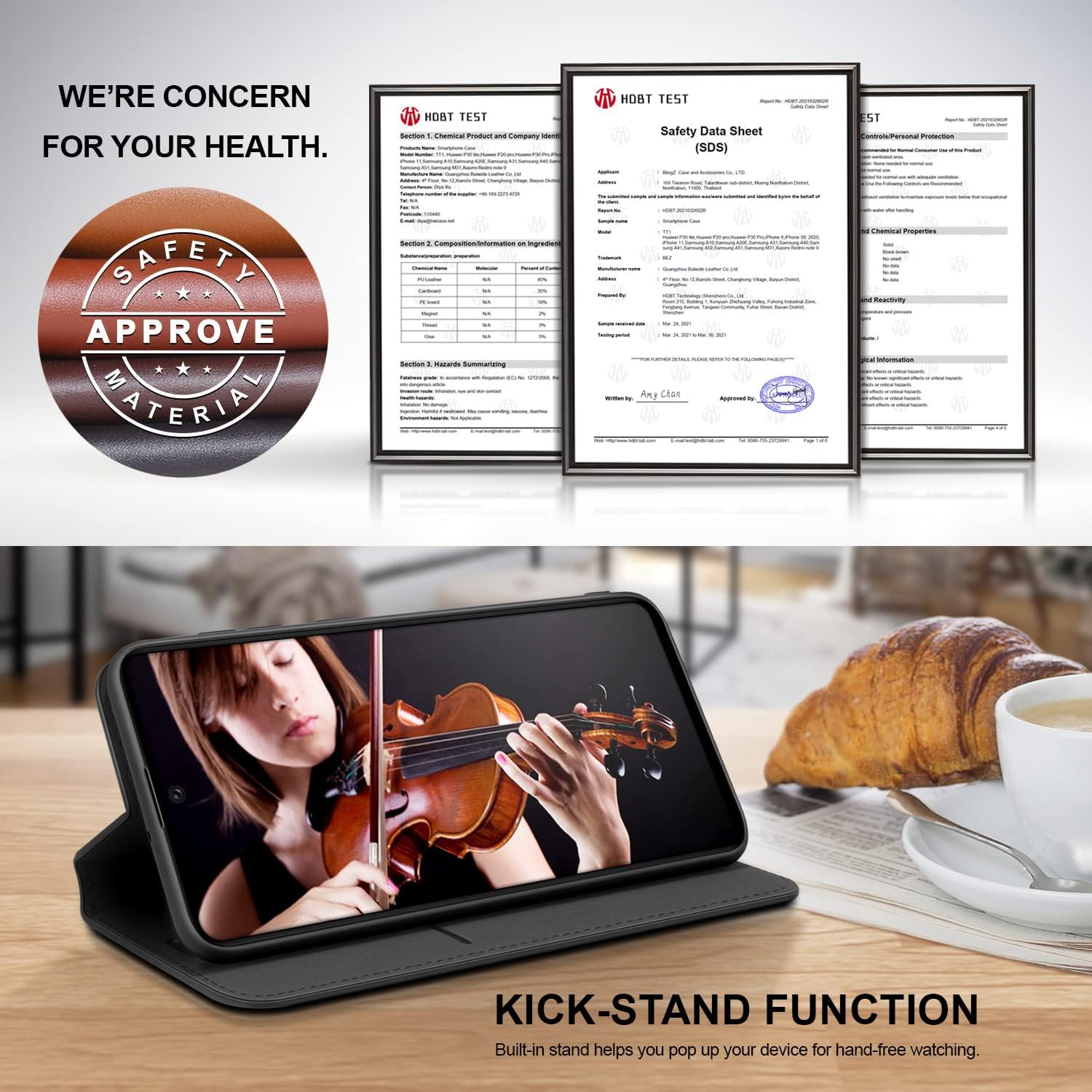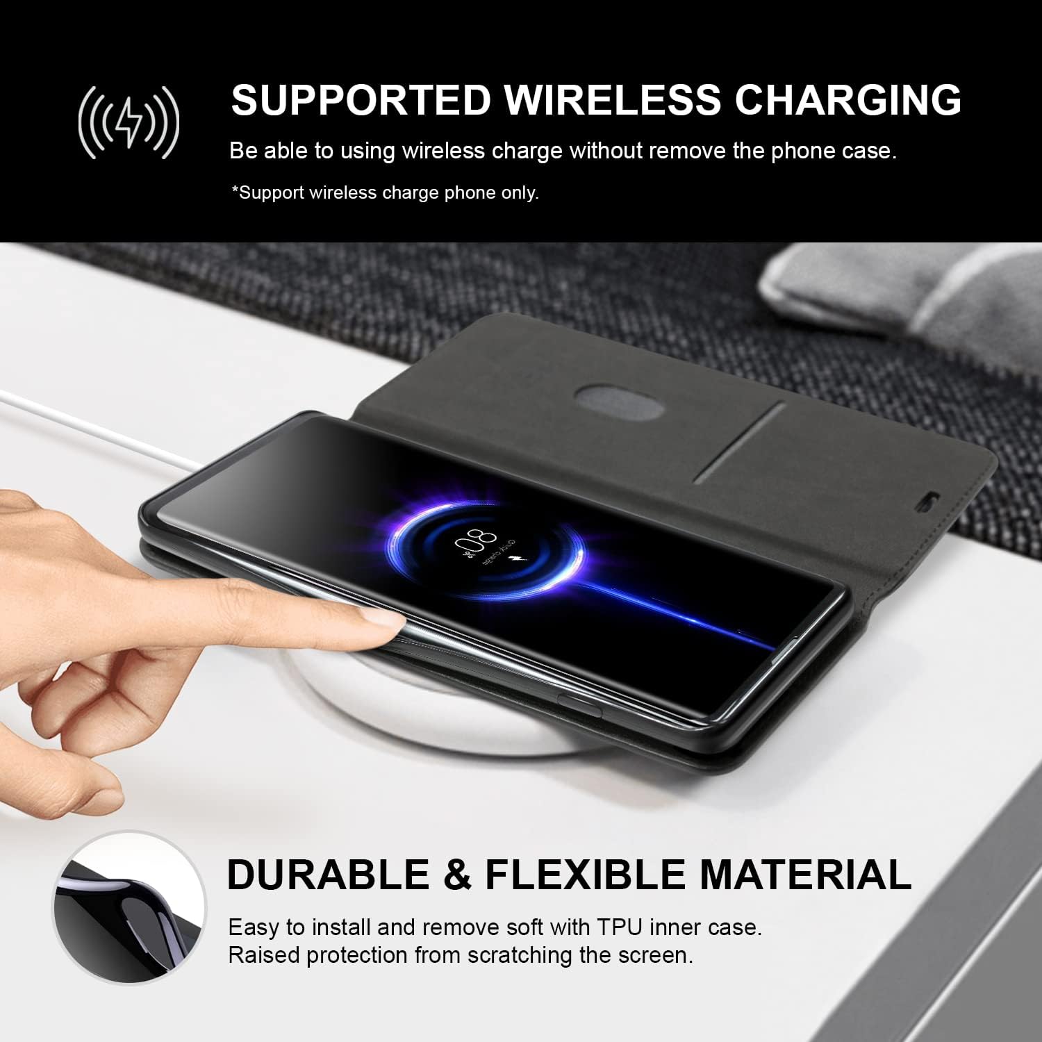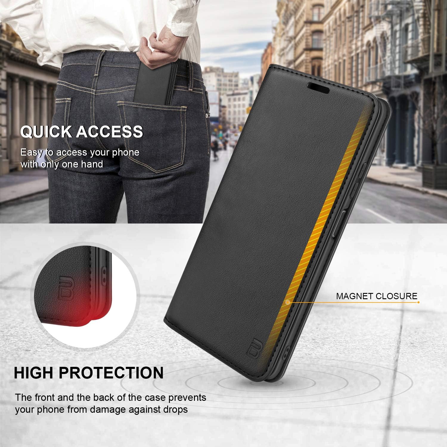 Étui portefeuille en cuir synthétique de haute qualité, doux et luxueuxFermeture magnétique pour une fermeture et une ouverture rapideDécoupe précise pour caméra, haut-parleur, boutons et ports, accès facile à tous les boutons