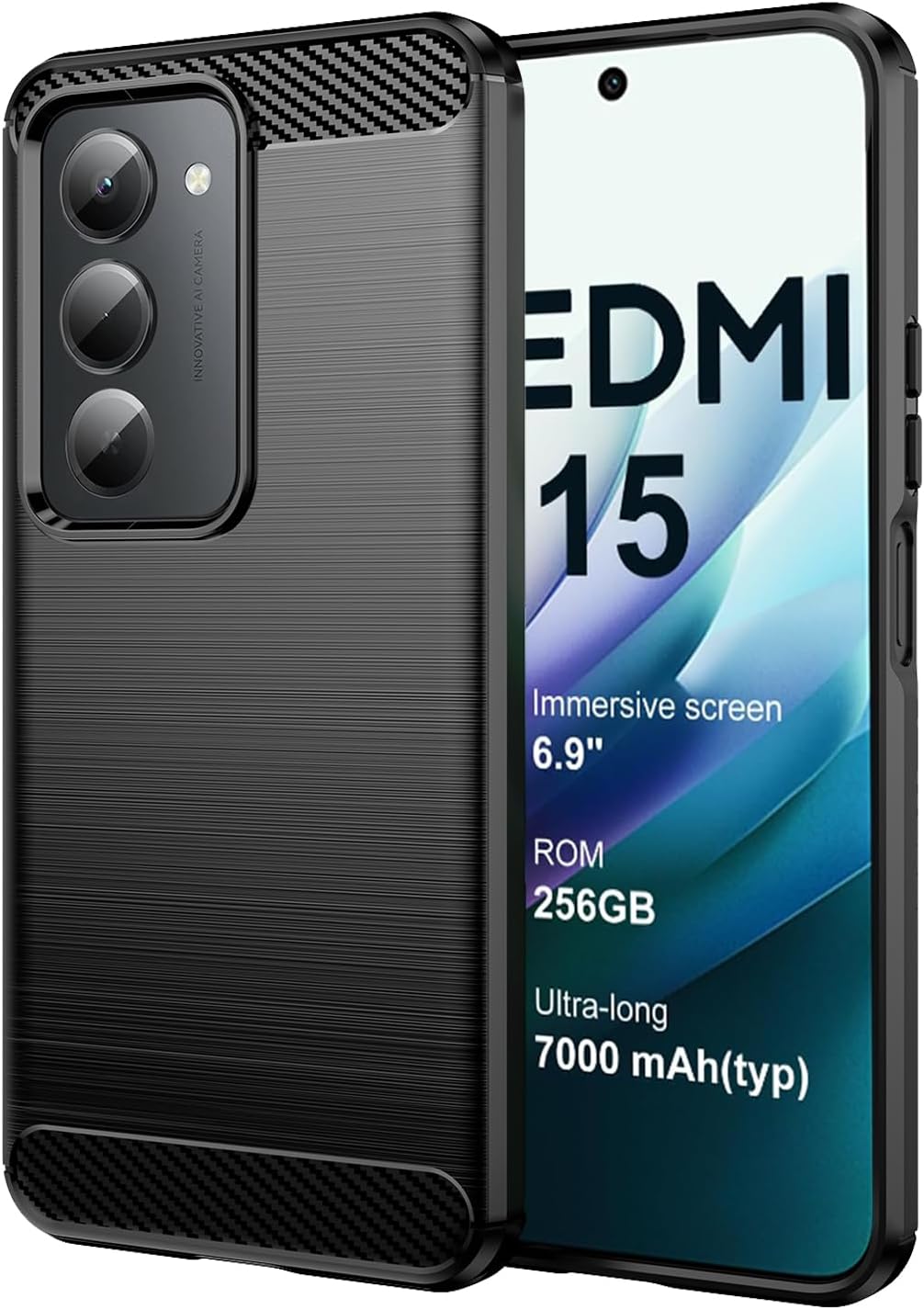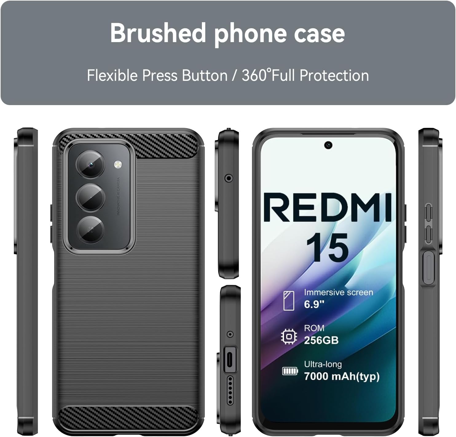 Case Wookfiss pour Xiaomi Redmi 15 4G, (fibre de carbone) couvercle de boîtier de protection en silicone TPU flexible premium compatible avec Xiaomi Redmi15 4G, anti-cratch / amortier – noir – noir