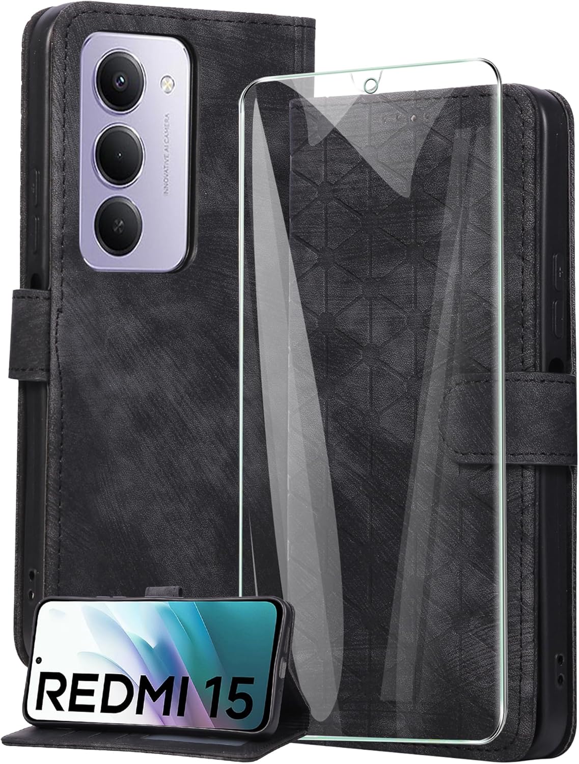 Étui BinandTeam pour Xiaomi Redmi 15 4G avec verre trempé, support de carte de portefeuille en cuir PU, boîtier à rabattement magnétique, pochette anti-choc - noir