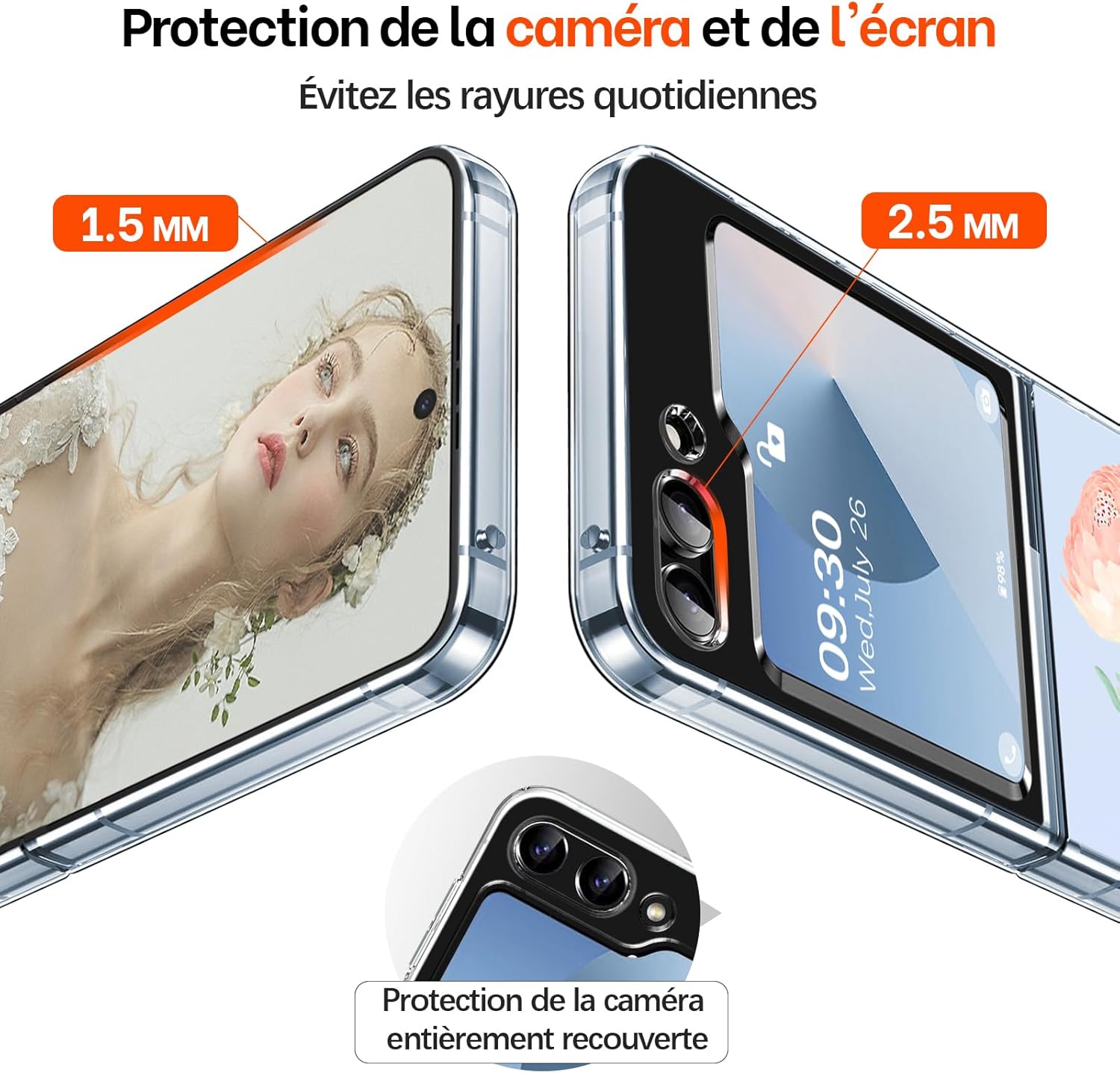 Protection accrue de l’appareil photo et de l’écran : coque souple pour téléphone portable Samsung Z Flip 6. La conception à couverture complète de la protection de l’appareil photo protège l’ensemble de votre appareil photo des rayures. Les bords surélevés autour de l’écran avant et de l’objectif de l’appareil photo peuvent gérer efficacement les effets d’une chute ou d’un choc soudain sans rayer votre beau téléphone.