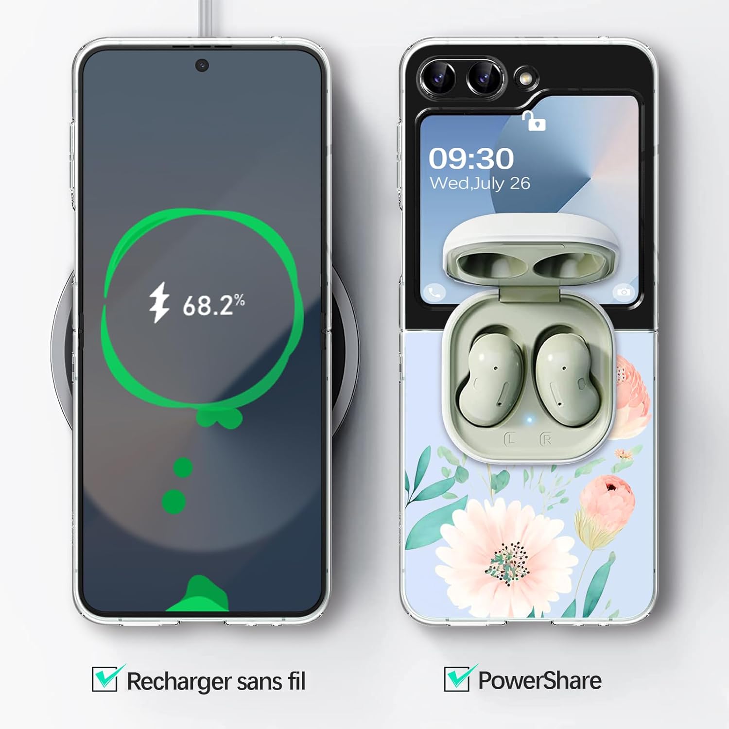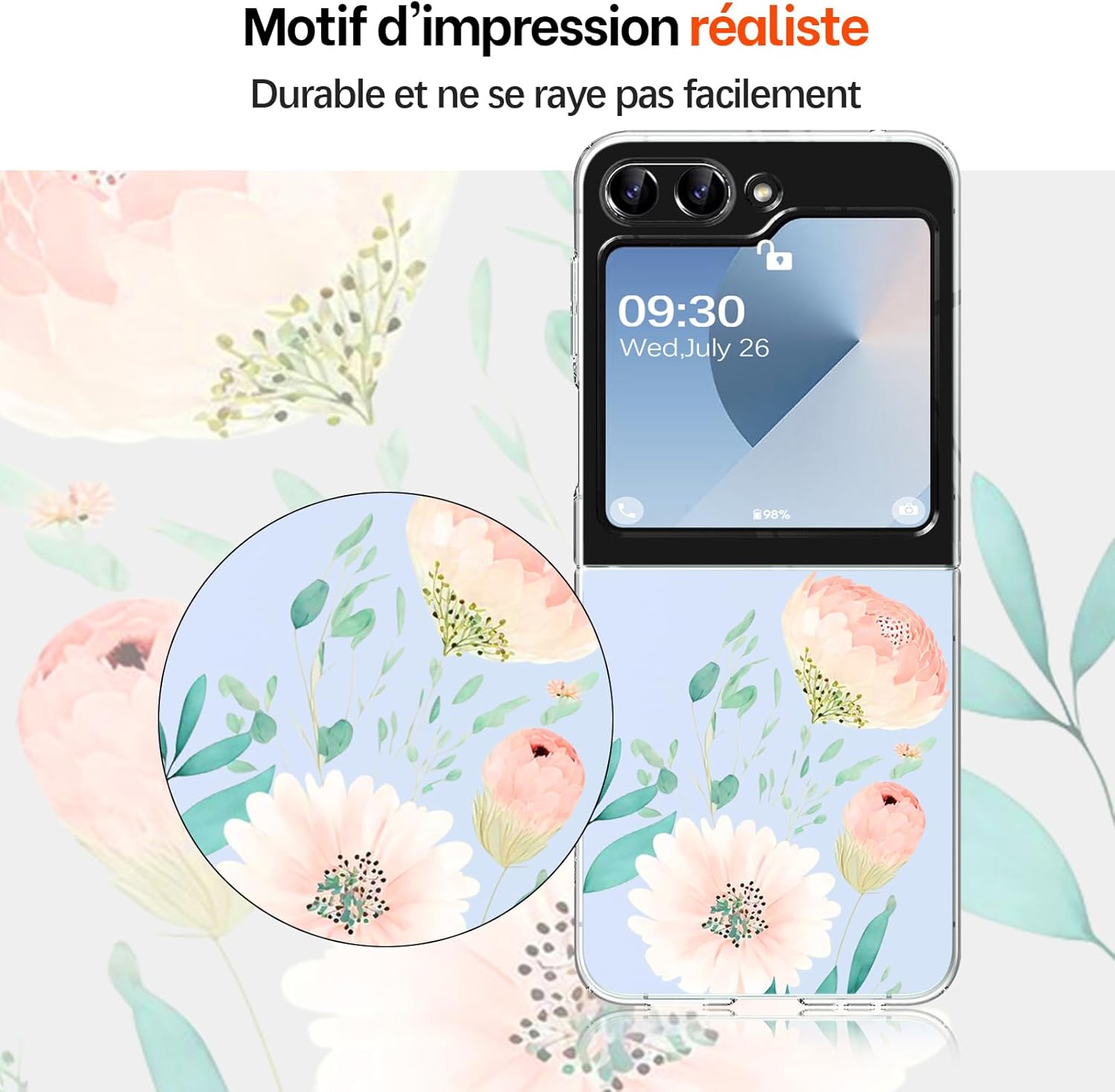Coque Z Flip 6 améliorée : coque pour Samsung Galaxy Z Flip 6 en silicone transparent avec motif de buisson de fleurs, qui met en valeur la ligne originale et le design original de votre téléphone.