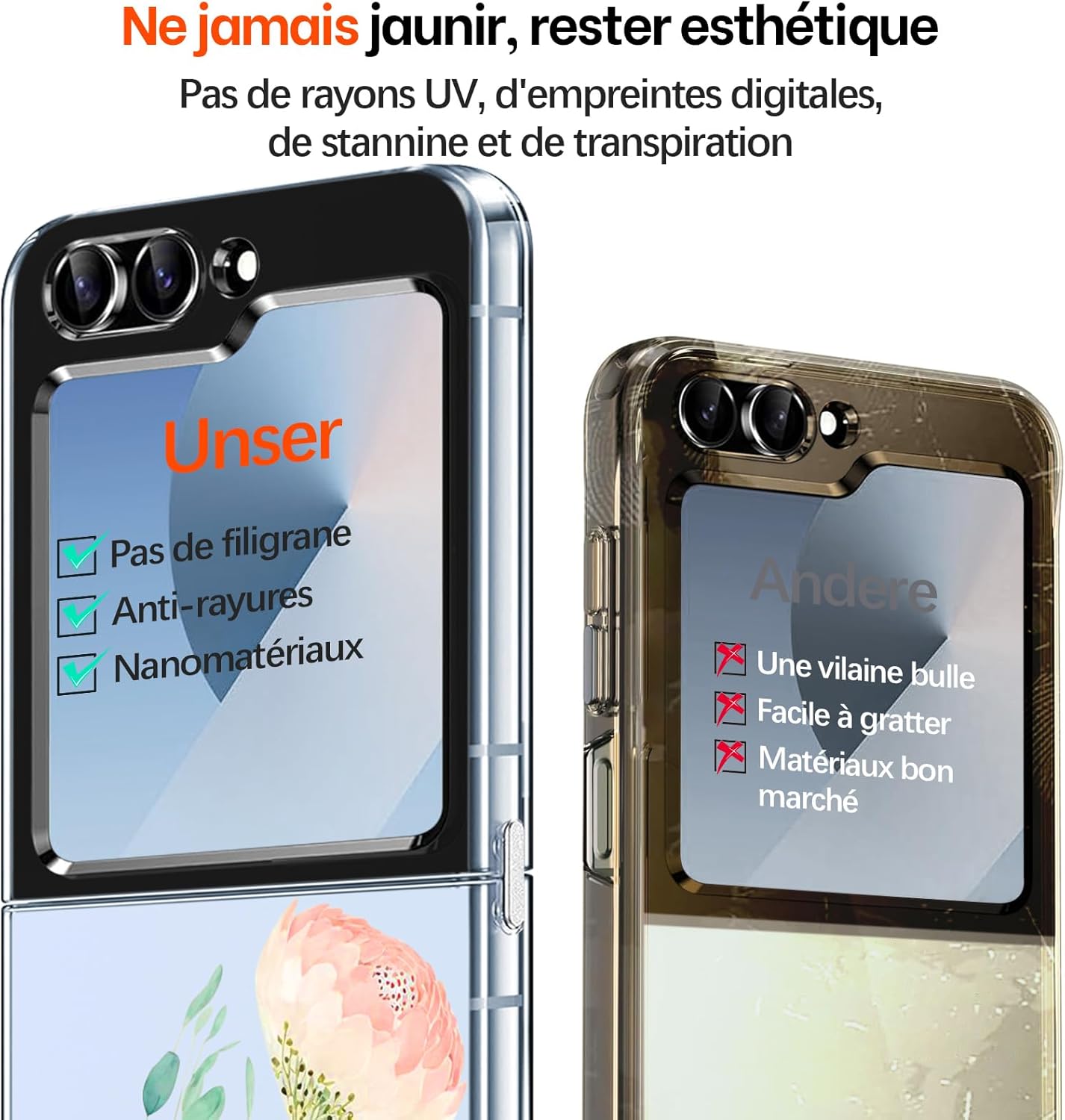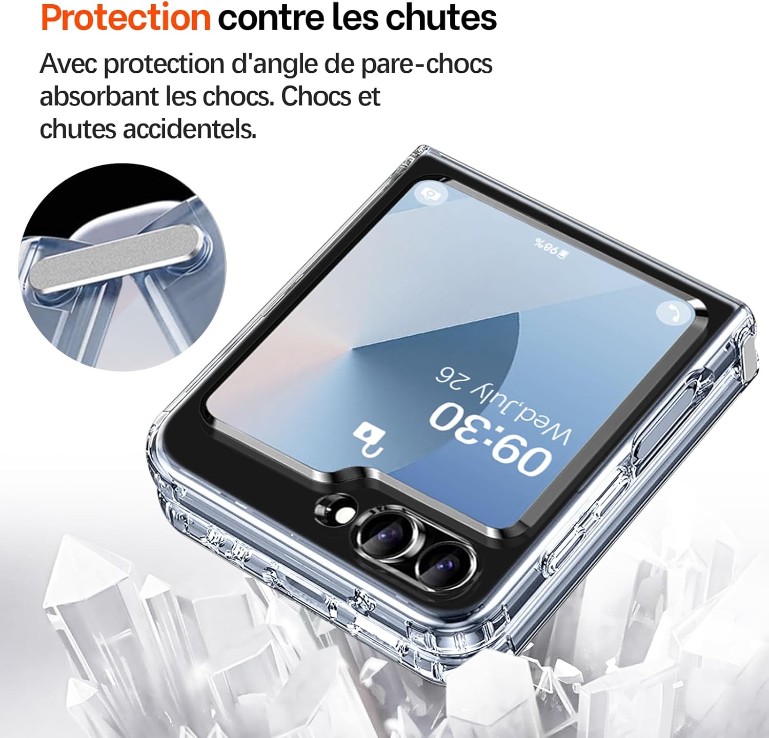 Avec boucle de connexion en métal : les parties supérieure et inférieure de la coque Samsung Galaxy Z Flip 6 sont reliées par une charnière métallique, il n’est pas facile de séparer les parties supérieure et inférieure ou de glisser du téléphone Galaxy Z Flip 6.