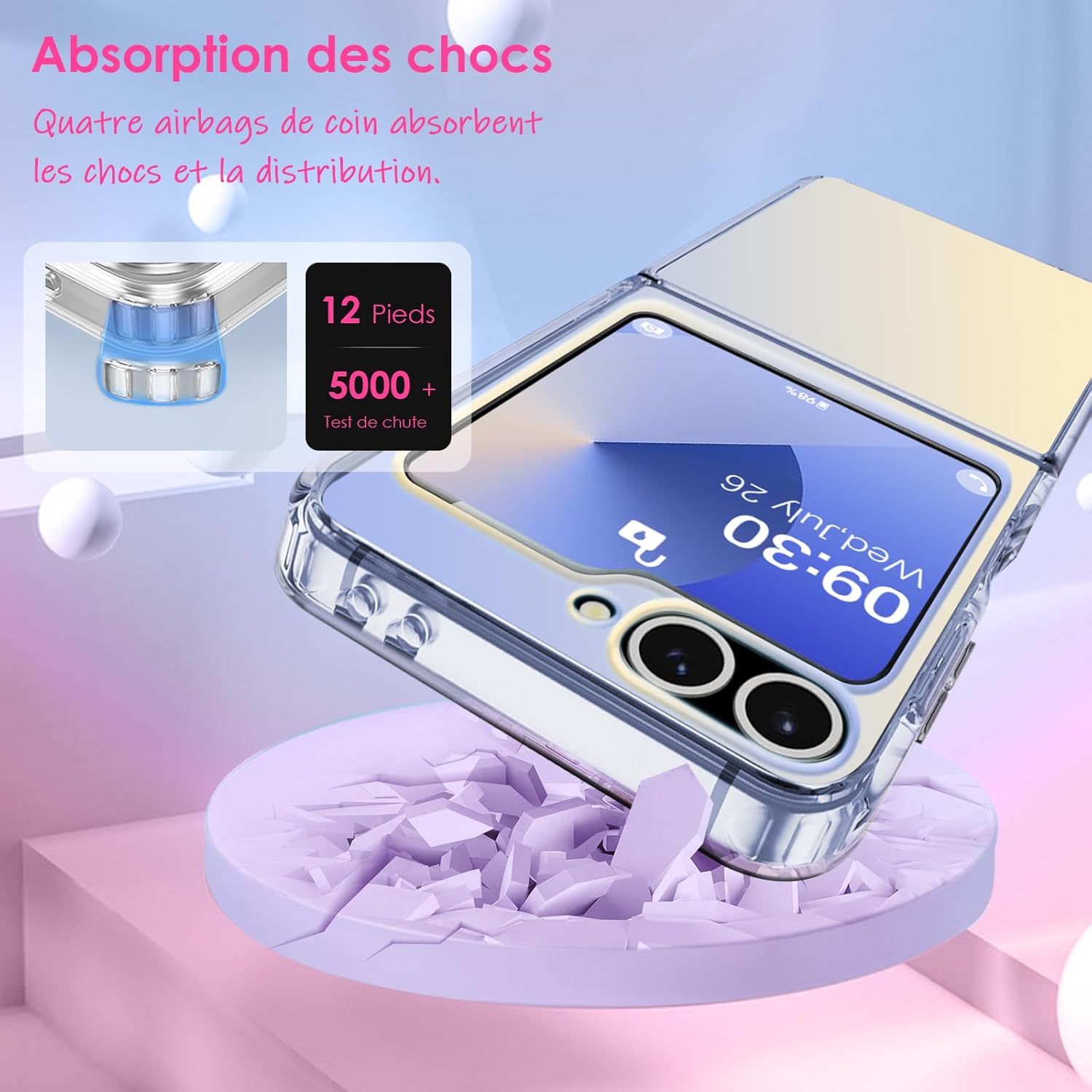 (Résistant aux rayures et aux chocs) La coque de protection en TPU pour Samsung Galaxy Z Flip 6 avec structure de rembourrage à 4 couches et dos en PC protège votre appareil contre les dommages en cas de chute. Un cadre surélevé autour de l’appareil photo et de l’écran offre une protection fiable aux parties importantes du Samsung Galaxy Z Flip 6.