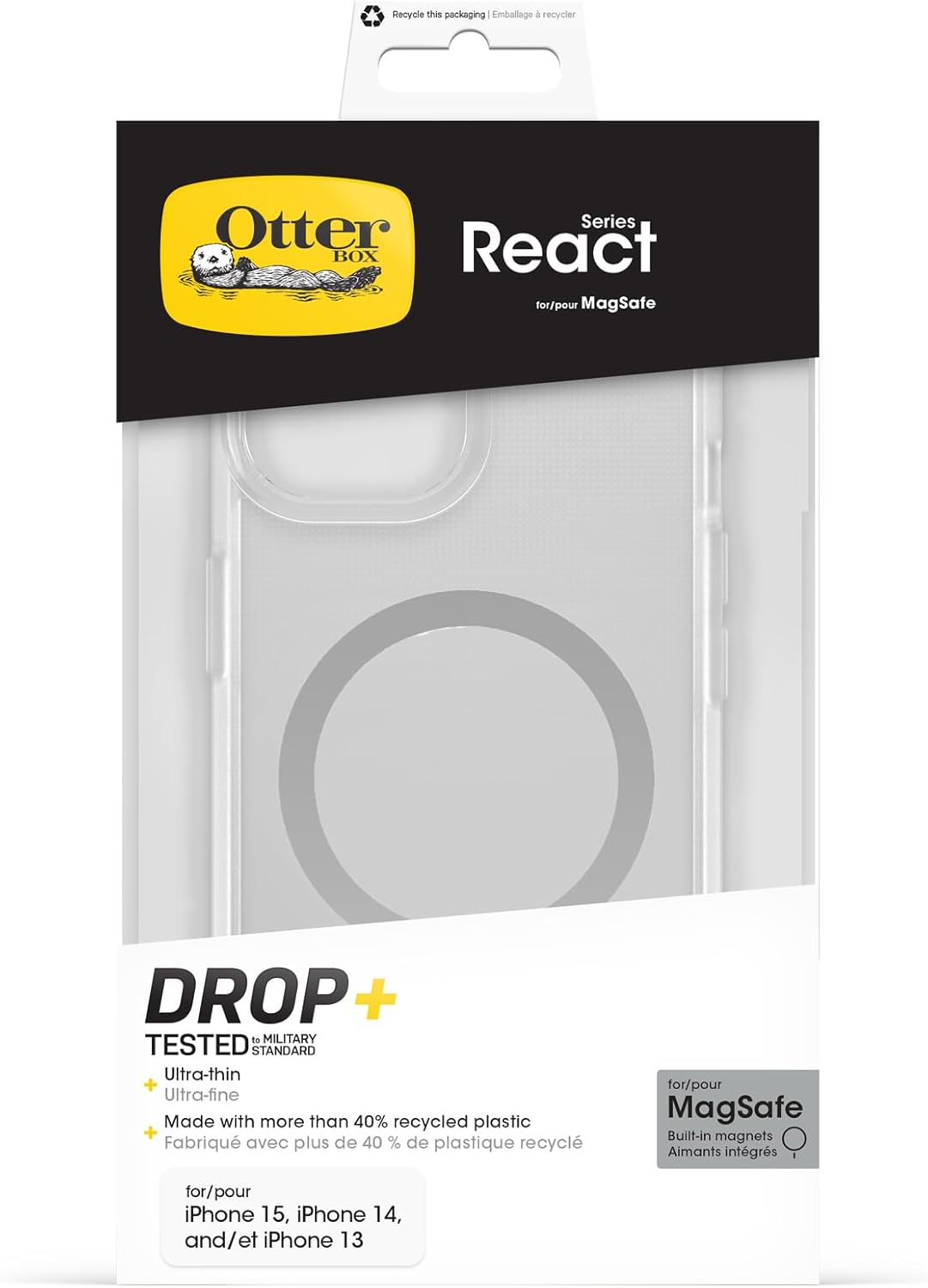La série React pour MagSafe contient au moins 40 % de contenu recyclé, fabriqué à partir de plastiques 100 % recyclés. La série Otterbox React pour MagSafe offre une protection élégante, soignée et parfaite contre les rayures et les rayures.
