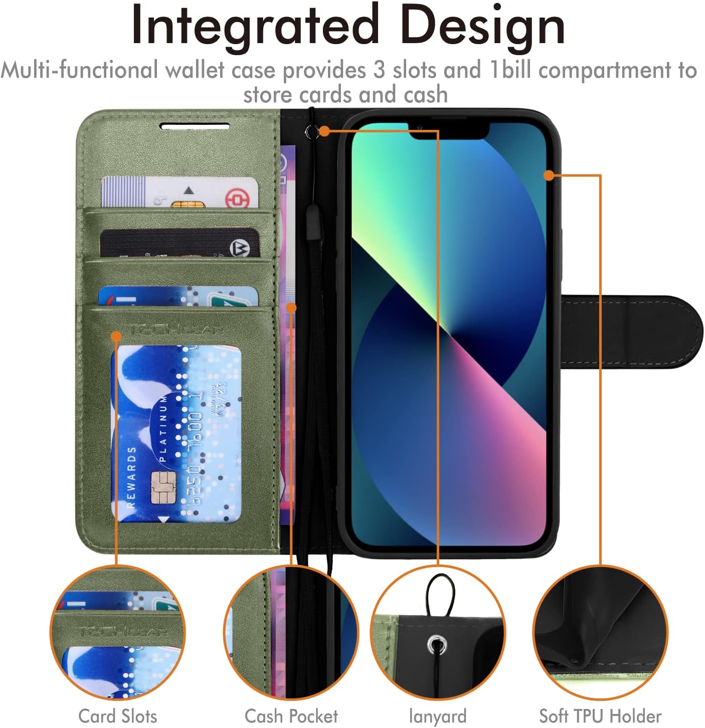 coque iphone 13 – TECHGEAR Étui portefeuille pour iPhone 13 – Étui portefeuille en cuir avec rabat de protection et emplacements pour cartes, béquille et dragonne, cuir PU lavande compatible avec iPhone 13 – Vert