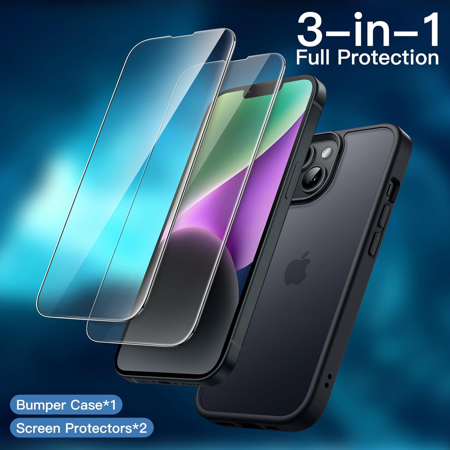 Coque iPhone 14 – Étui JetEch 3 en 1 mate pour iPhone 14 6,1 pouces avec 2 packs de protecteur d’écran en verre trempé, couvercle de téléphone translucide givré (noir).