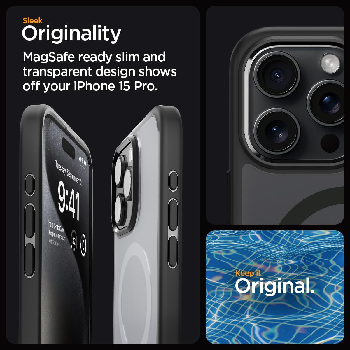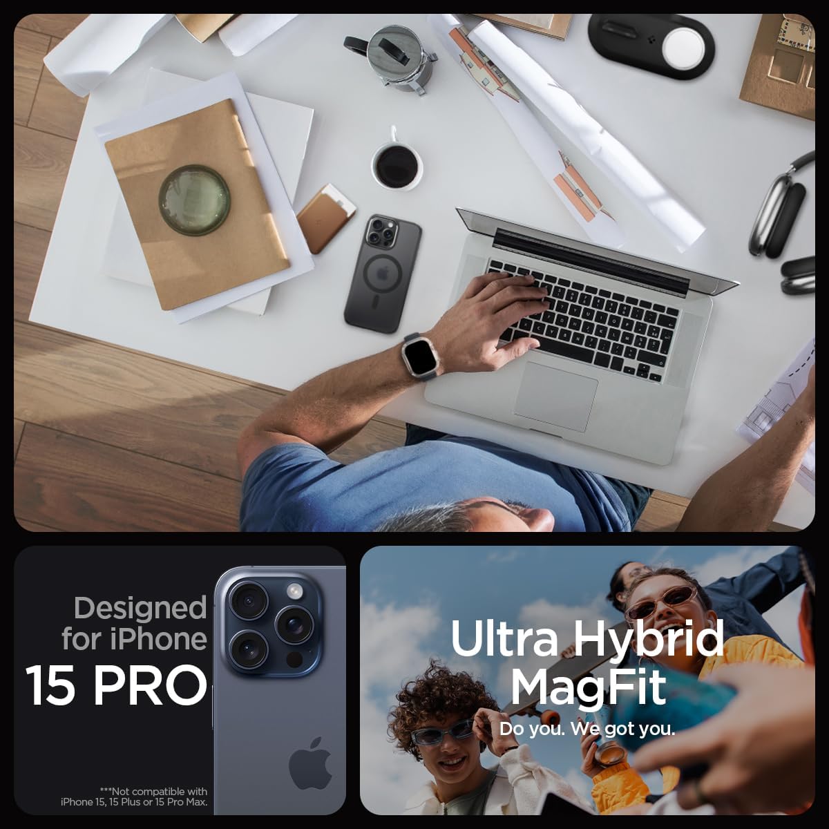 Coque iPhone 15 – Coque Spigen iPhone 15 Pro, Ultra Hybrid MagFit, (semi-transparente) 6,1 pouces – Noir givré