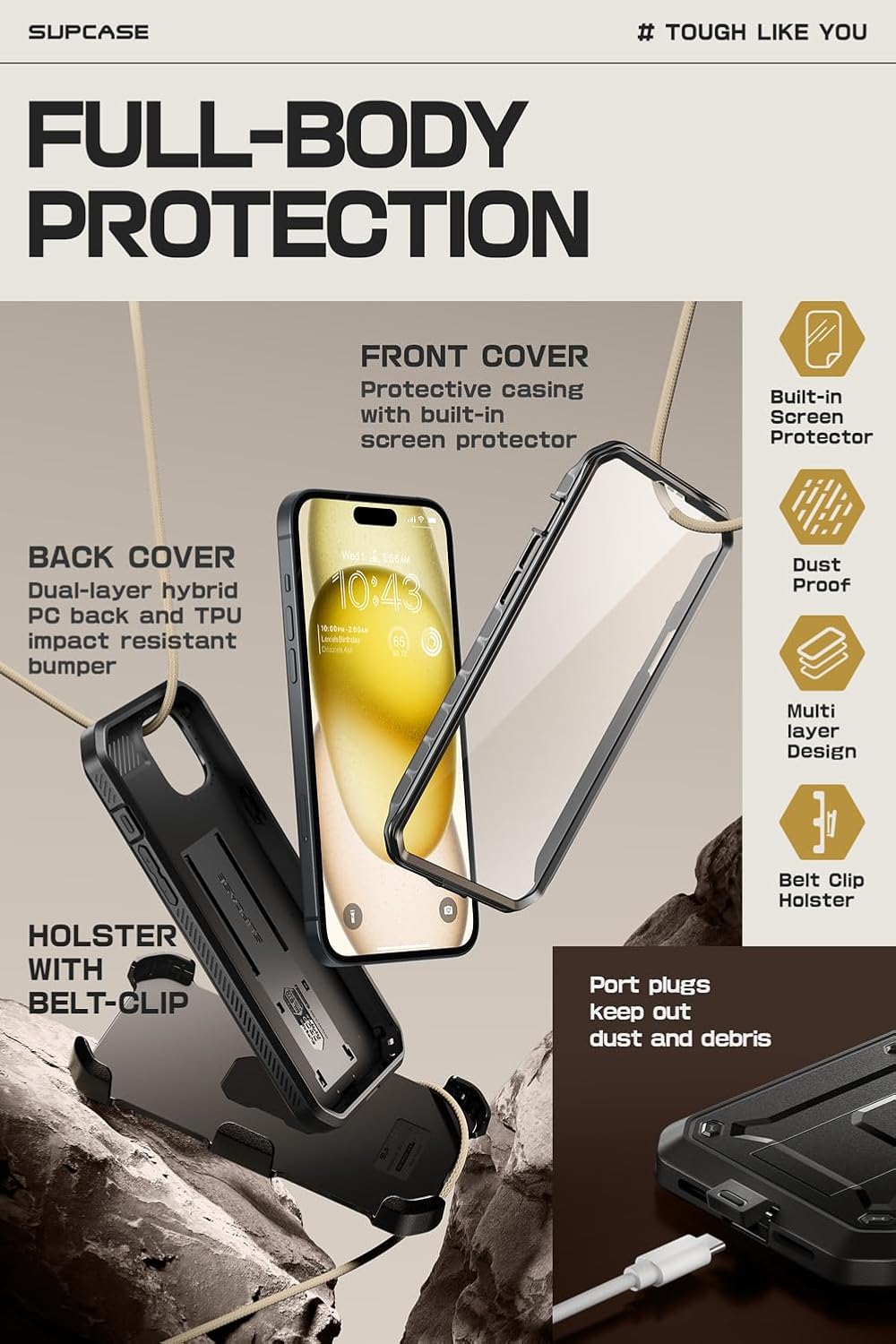 (Boîtier rotatif) Clip de ceinture pivotant amovible pour un transport pratique, mains libres, sans poche. Le boîtier dispose également d’une béquille intégrée.