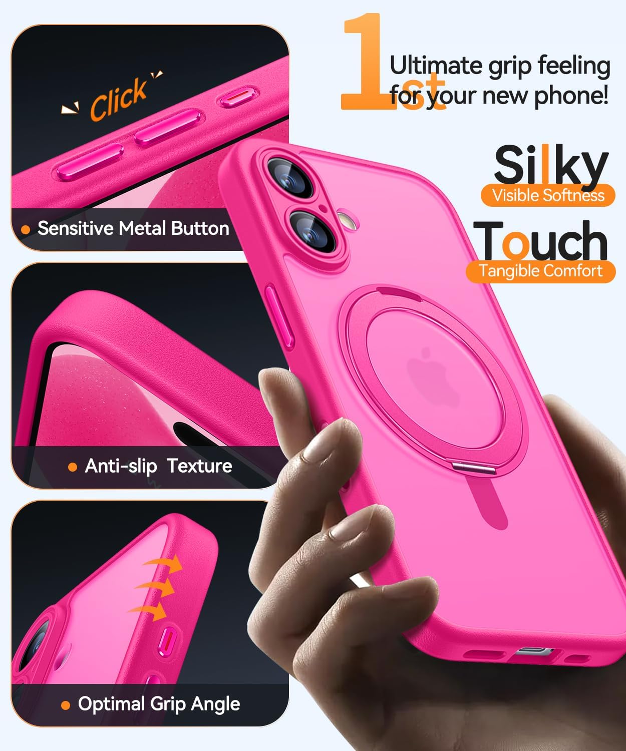 Coque iPhone 17 – CANSHN Coque magnétique pour iPhone 17 (6,3 pouces) avec support rotatif à 360° (bouton de contrôle de l’appareil photo), (protection complète de l’appareil photo), fond mat translucide, rose vif