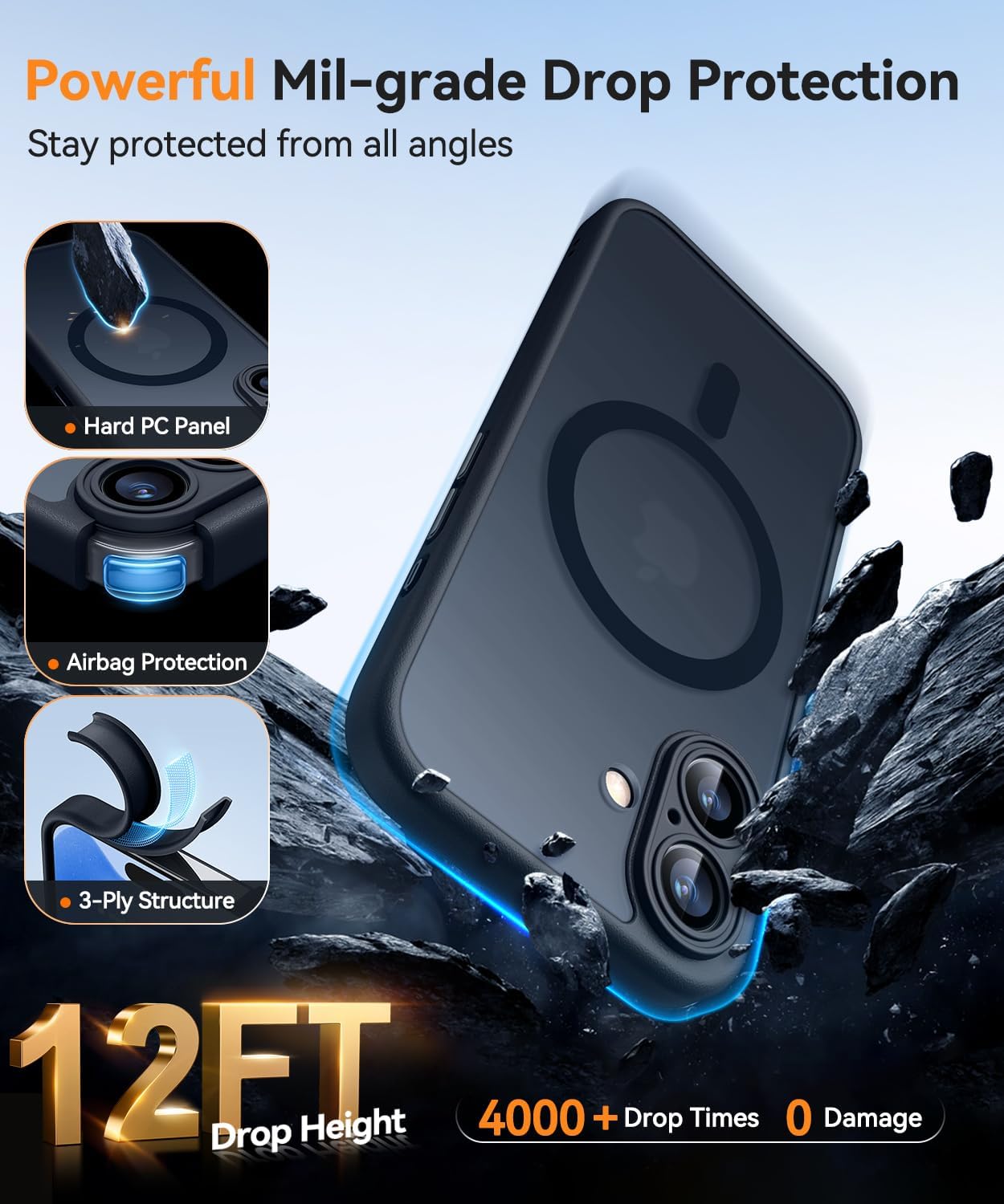 Le texte indique « Étui magnétique ultra résistant aux chocs ». Image marketing en gros plan montrant les caractéristiques de la coque du téléphone avec des graphismes orange accentués et des légendes relatives aux spécifications techniques.Le texte indique « Étui magnétique ultra résistant aux chocs ». Image marketing en gros plan montrant les caractéristiques de la coque du téléphone avec des graphismes orange accentués et des légendes relatives aux spécifications techniques.