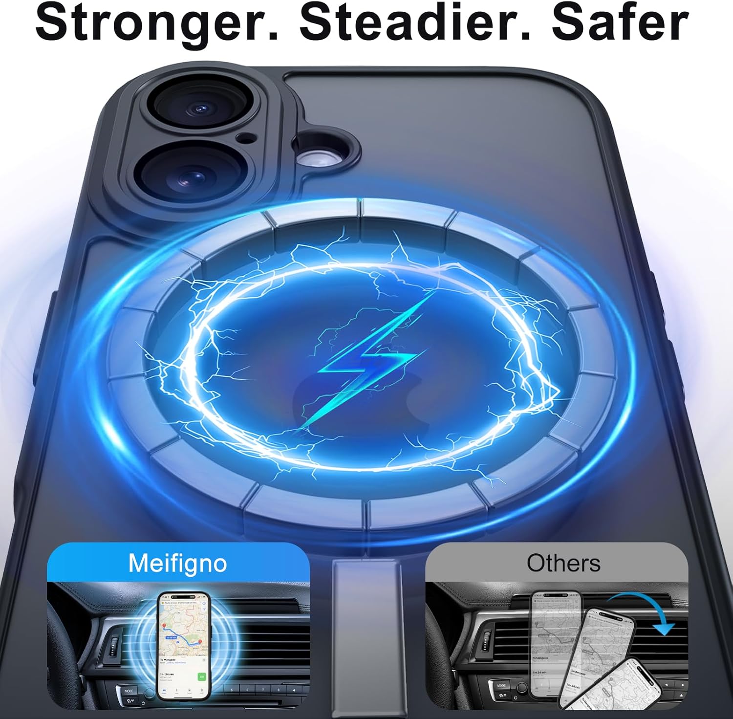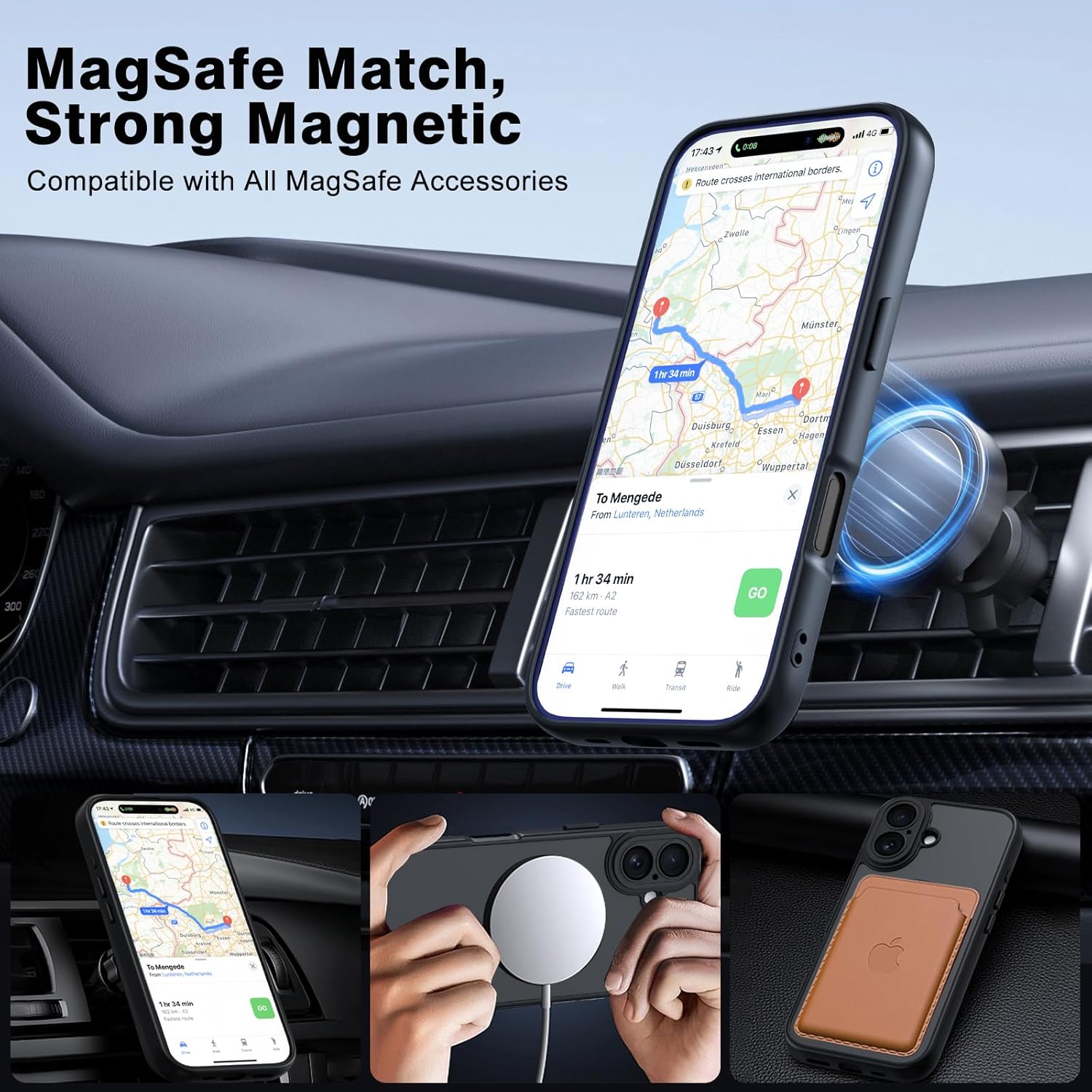 Compatibilité totale MagSafe Parfaitement compatible avec tous les accessoires MagSafe (chargeurs, supports de voiture, portefeuilles, etc.), cette coque intègre un aimant haute puissance et un anneau magnétique en alliage aéronautique pour un alignement parfait et une charge sans fil rapide et stable.