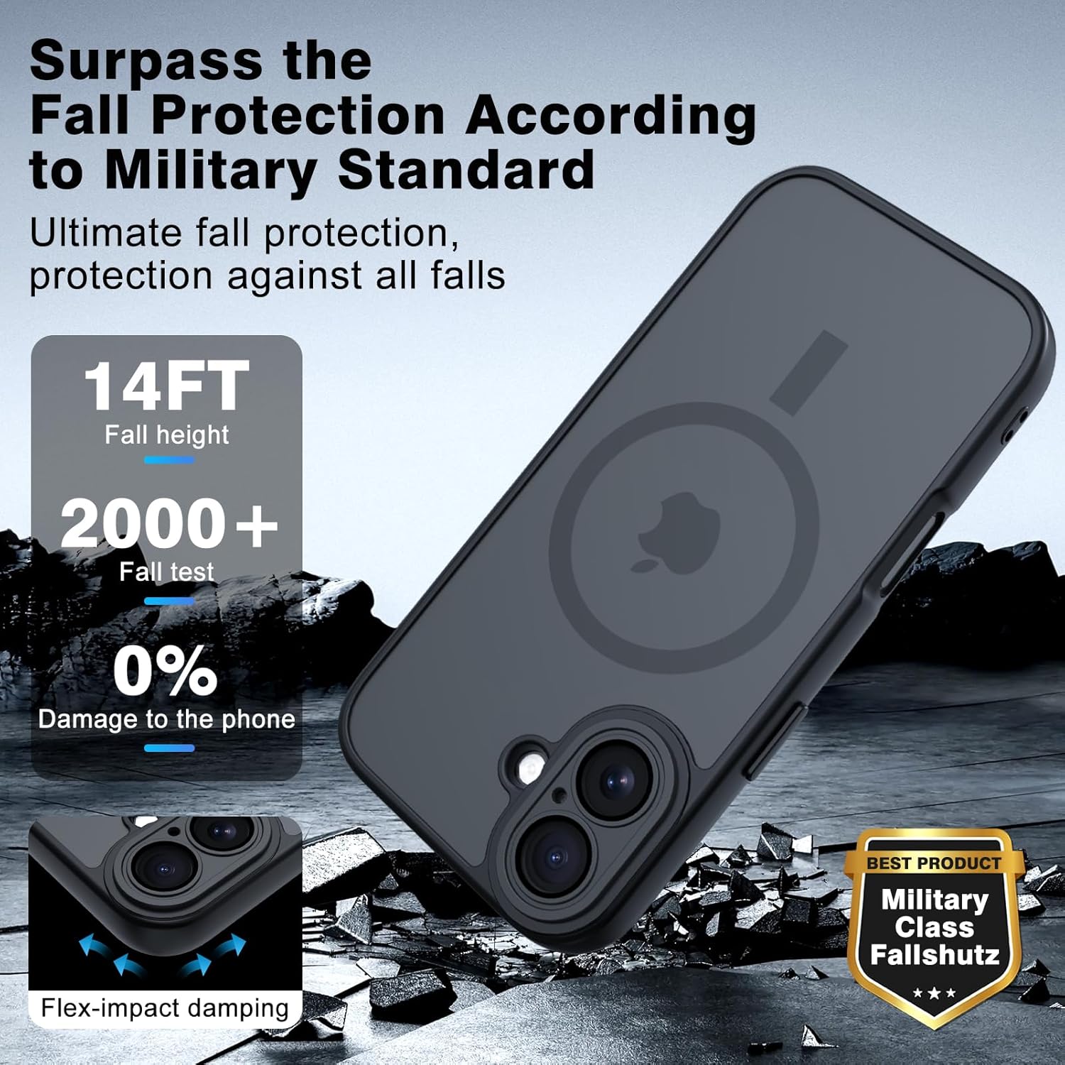 Protection antichute militaire Equipée de la technologie Air Cushion, la coque intègre 4 airbags de coin pour une absorption optimale des chocs. Les bords surélevés de l’écran et de l’objectif protègent contre les rayures et offrent une protection à 360° contre les chutes et les impacts.