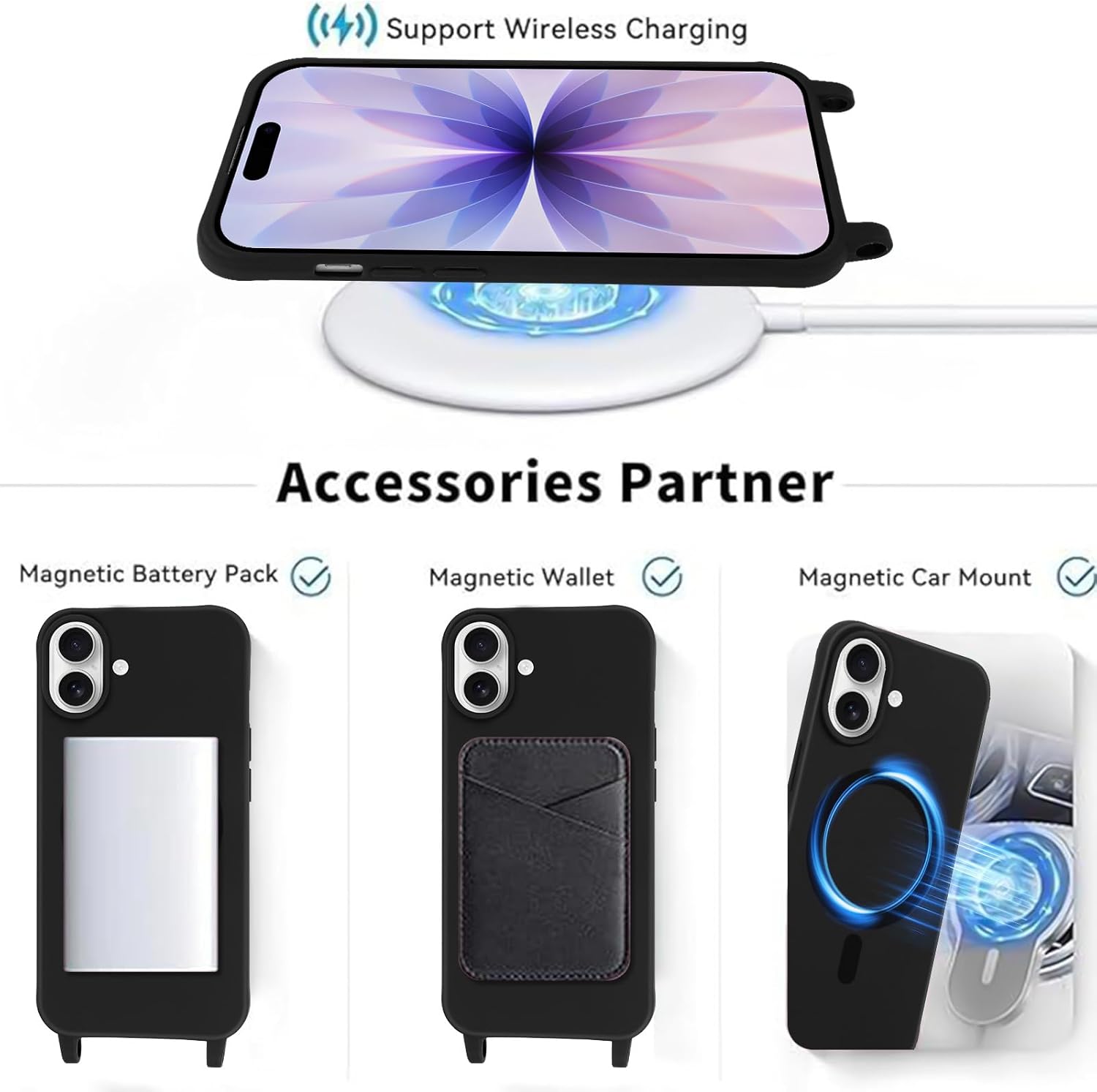 Fixation magnétique : l’anneau magnétique intégré améliore l’attraction magnétique pour rendre le chargement sans fil plus rapide et plus facile que jamais, compatible et se verrouille en toute sécurité sur tout accessoire MagSafe, tels que les chargeurs sans fil, les portefeuilles magnétiques, les supports magnétiques de voiture, l’alimentation mobile magnétique et plus encore.