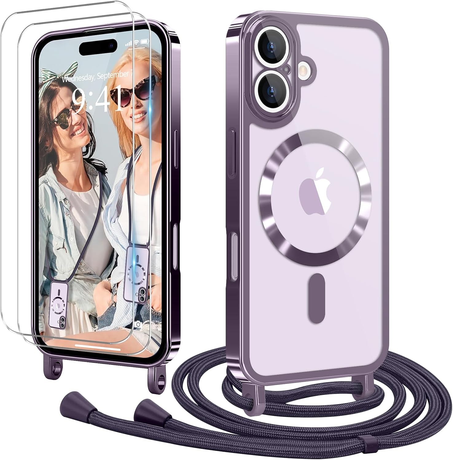 Coque iPhone 17 - Coque pour iPhone 17 avec cordon de serrage + 2 verres trempés transparents en silicone TPU Bumper Case Cover avec cordon réglable, coque magnétique pour iPhone 17 Violet