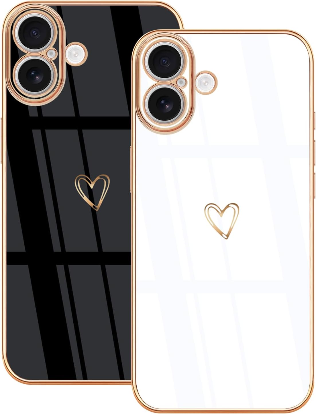 Coque iPhone 17 – Lot de 2 coques pour iPhone 17, motif cœur, silicone TPU souple, pare-chocs pour filles et femmes, noir et blanc