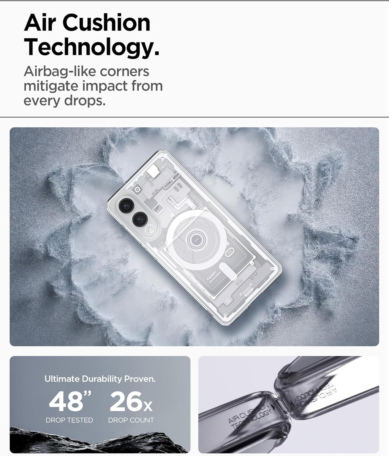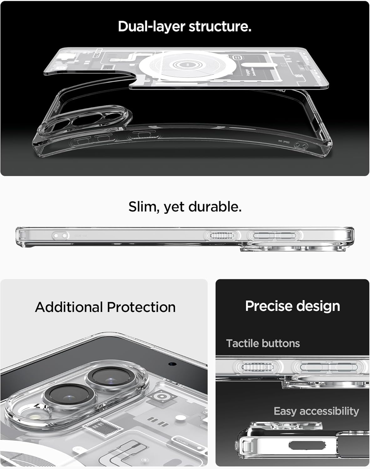 (Protection x Technology) Les technologies brevetées Air Cushion et Rear Guard de Spigen protègent votre téléphone avec un design hybride en TPU et un dos en PC transparent.