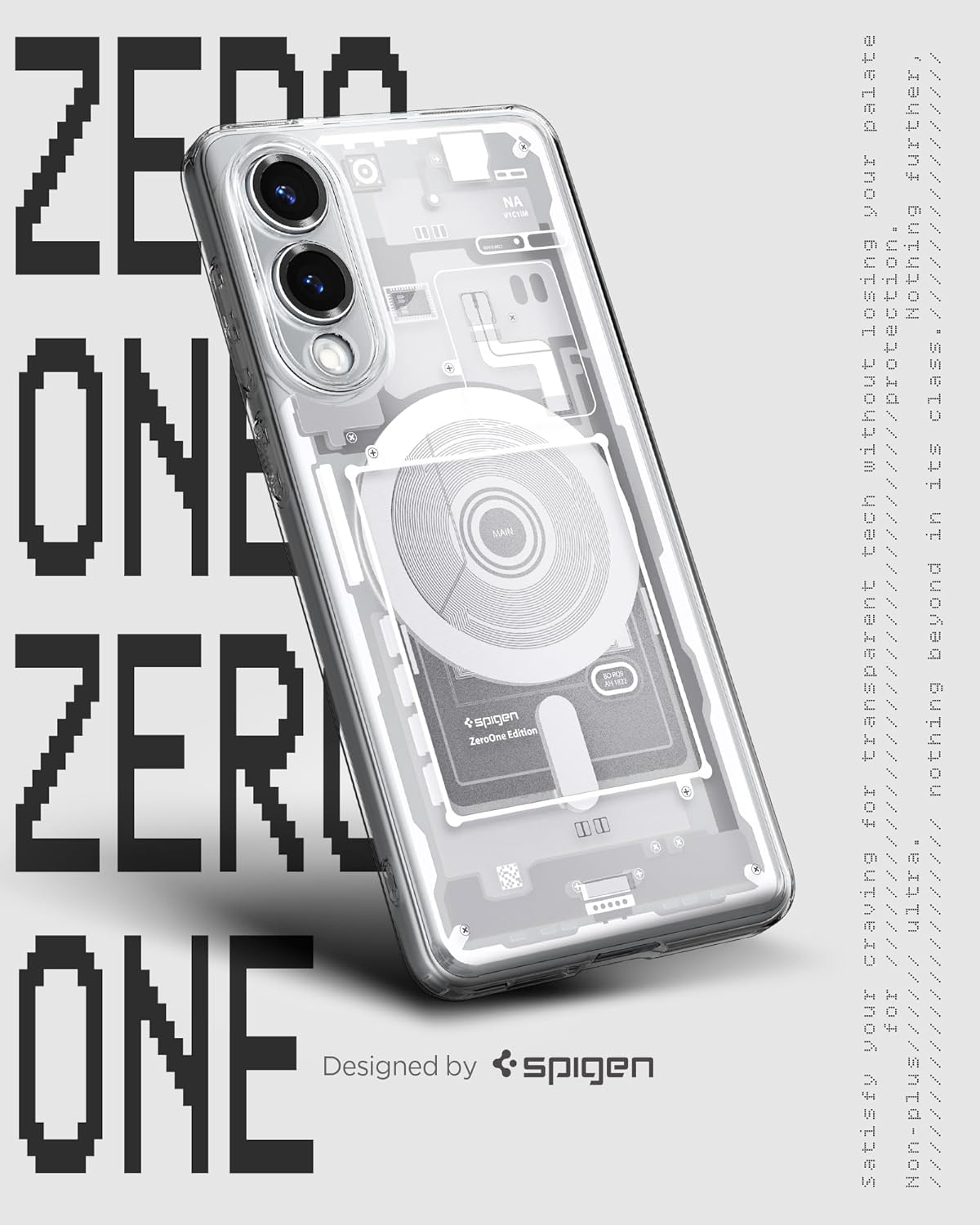 (Zero One Design) Un design Spigen moderne et schématique qui révèle avec finesse la couleur d’origine du téléphone mobile et de ses composants internes.