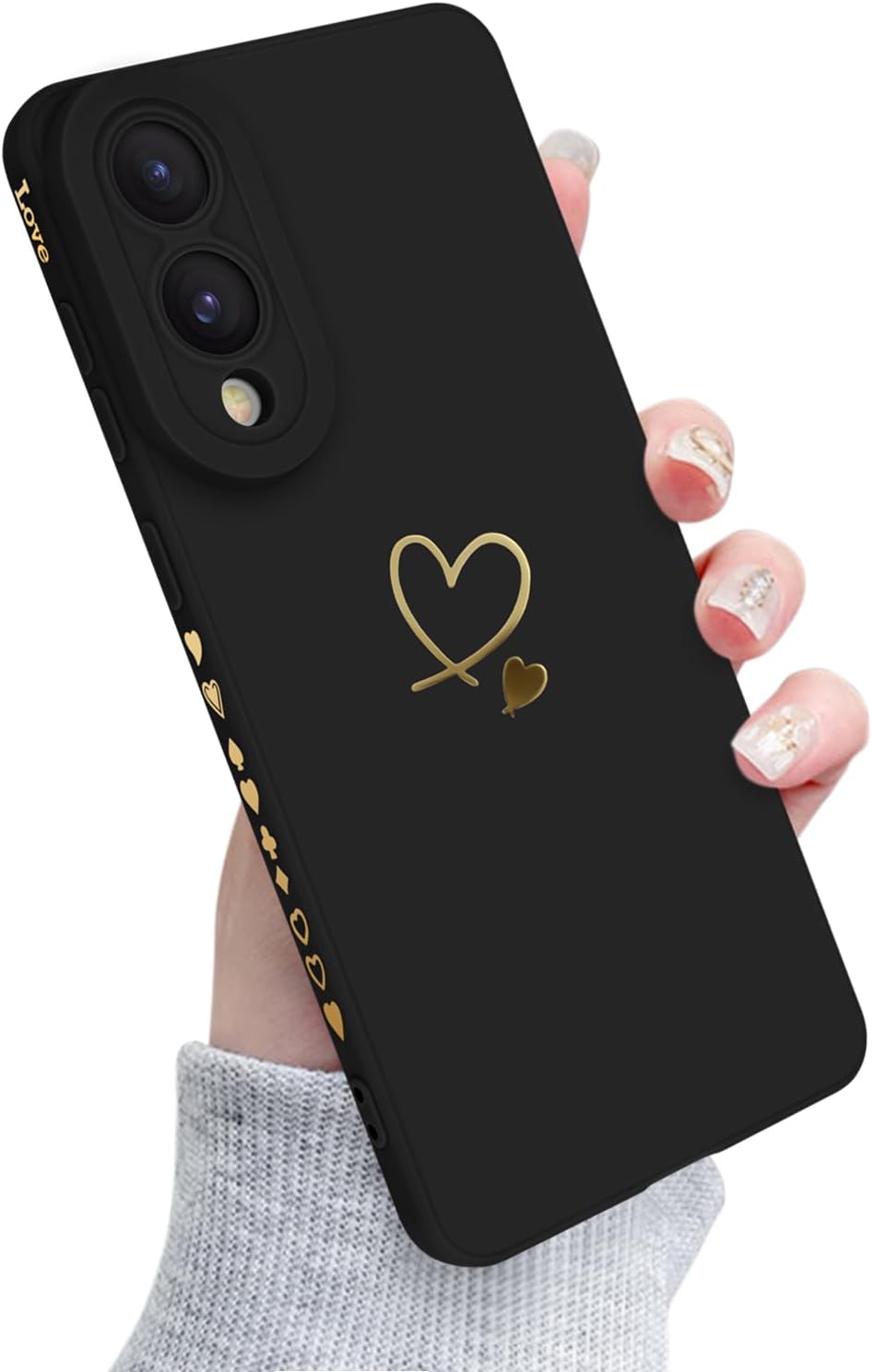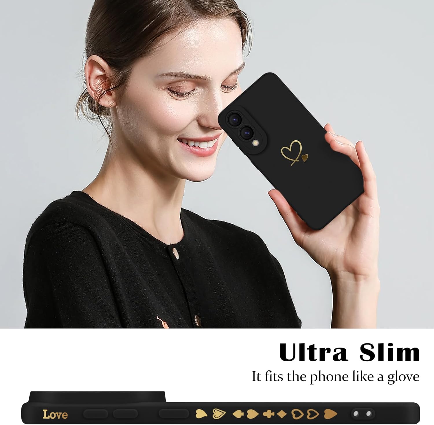 Étui pour smartphone noir avec motif cœur doré. Il est doux au toucher, léger et offre une excellente prise en main. Présenté contre le visage d'une personne portant un chandail beige.Étui pour smartphone noir avec motif cœur doré. Il est doux au toucher, léger et offre une excellente prise en main. Présenté contre le visage d'une personne portant un chandail beige.