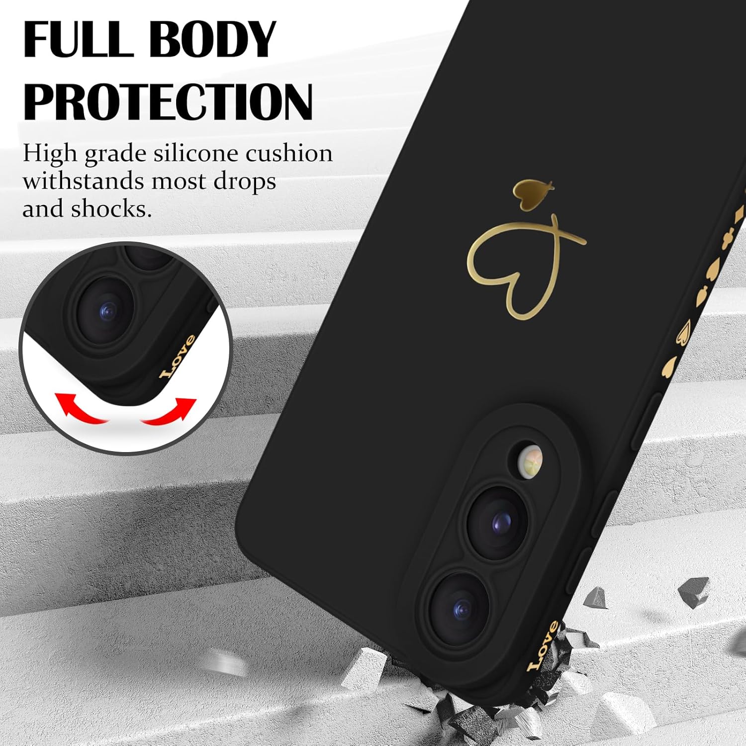 Étui pour smartphone noir avec logo en forme de cœur doré, illustré en train de protéger l'appareil contre les fissures. Découpe visible pour deux caméras. L'étui met l'accent sur la durabilité et le style.Étui pour smartphone noir avec logo en forme de cœur doré, illustré en train de protéger l'appareil contre les fissures. Découpe visible pour deux caméras. L'étui met l'accent sur la durabilité et le style.