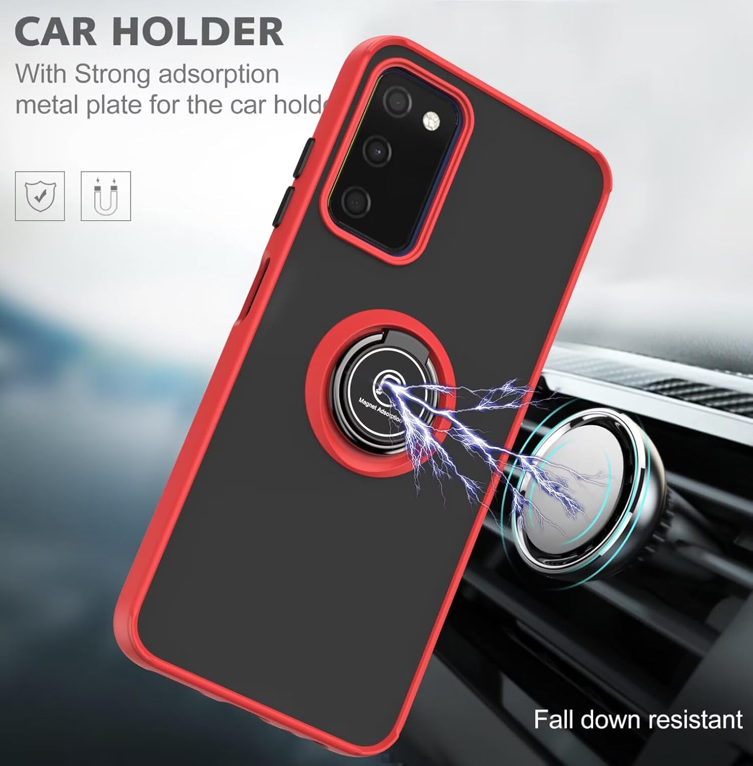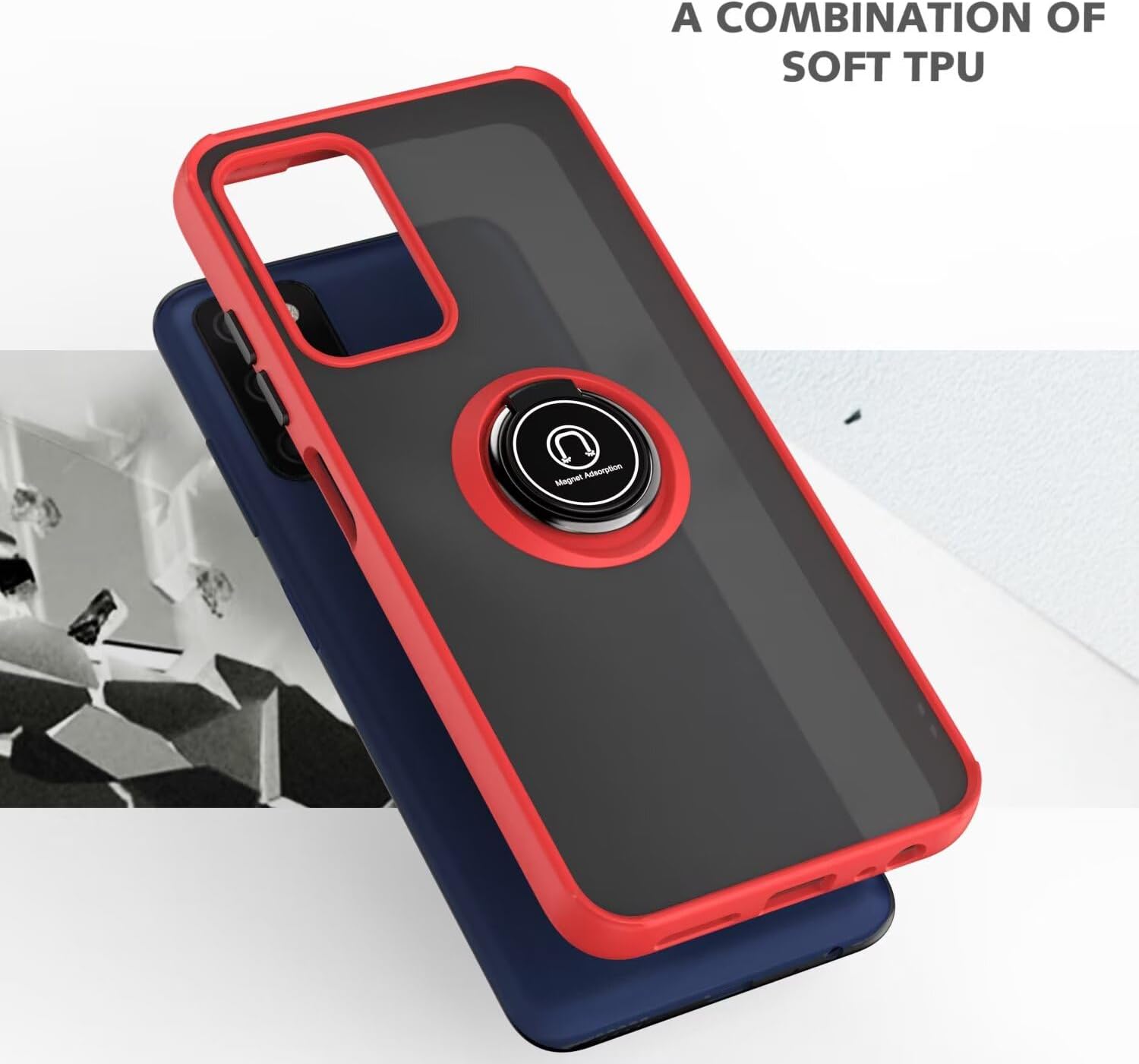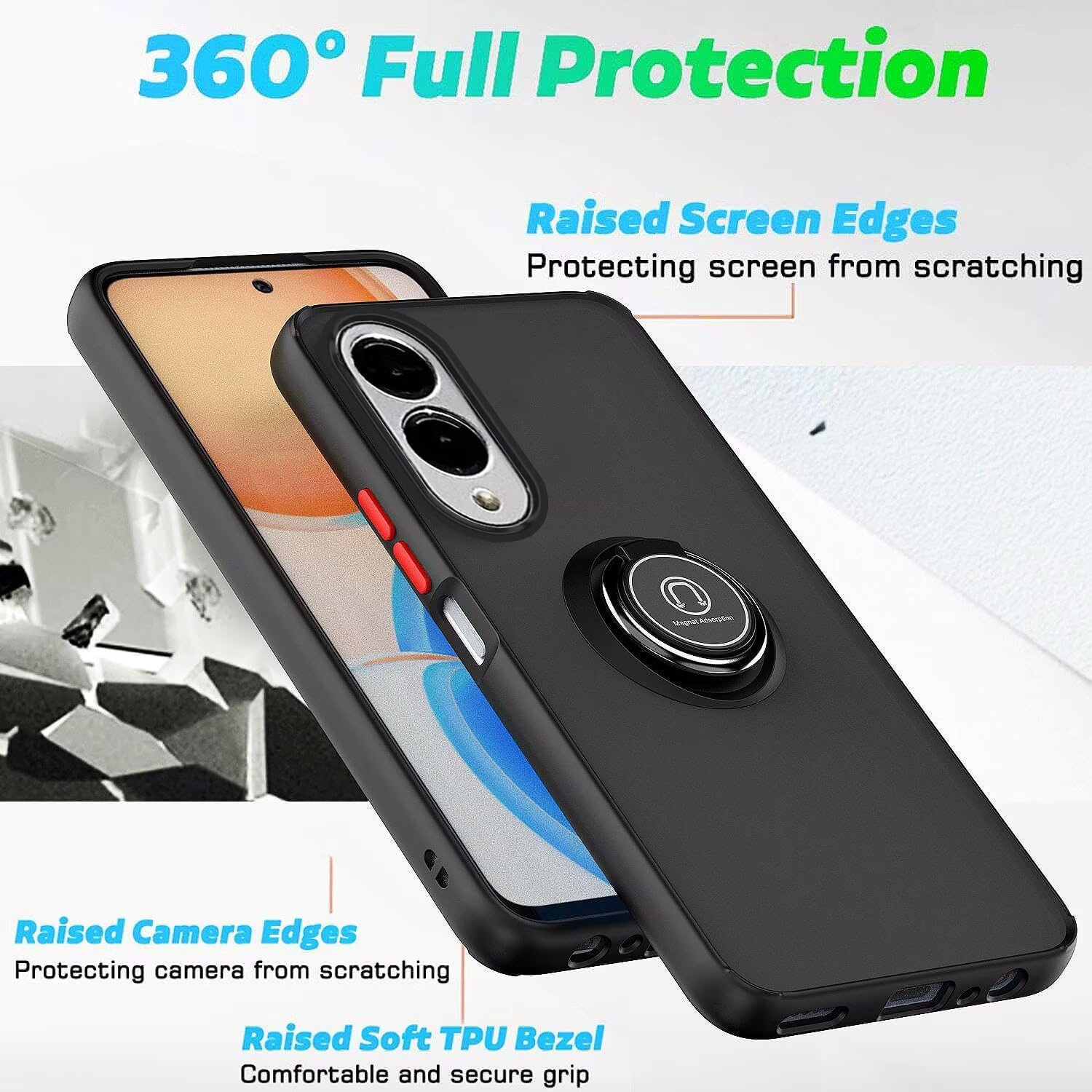 Il y a un anneau de support rotatif et une base magnétique à l’arrière de la coque du téléphone, qui vous aident à soutenir facilement le téléphone sur la table pour le tenir debout, ou à le fixer sur la console centrale de la voiture pour libérer vos mains.