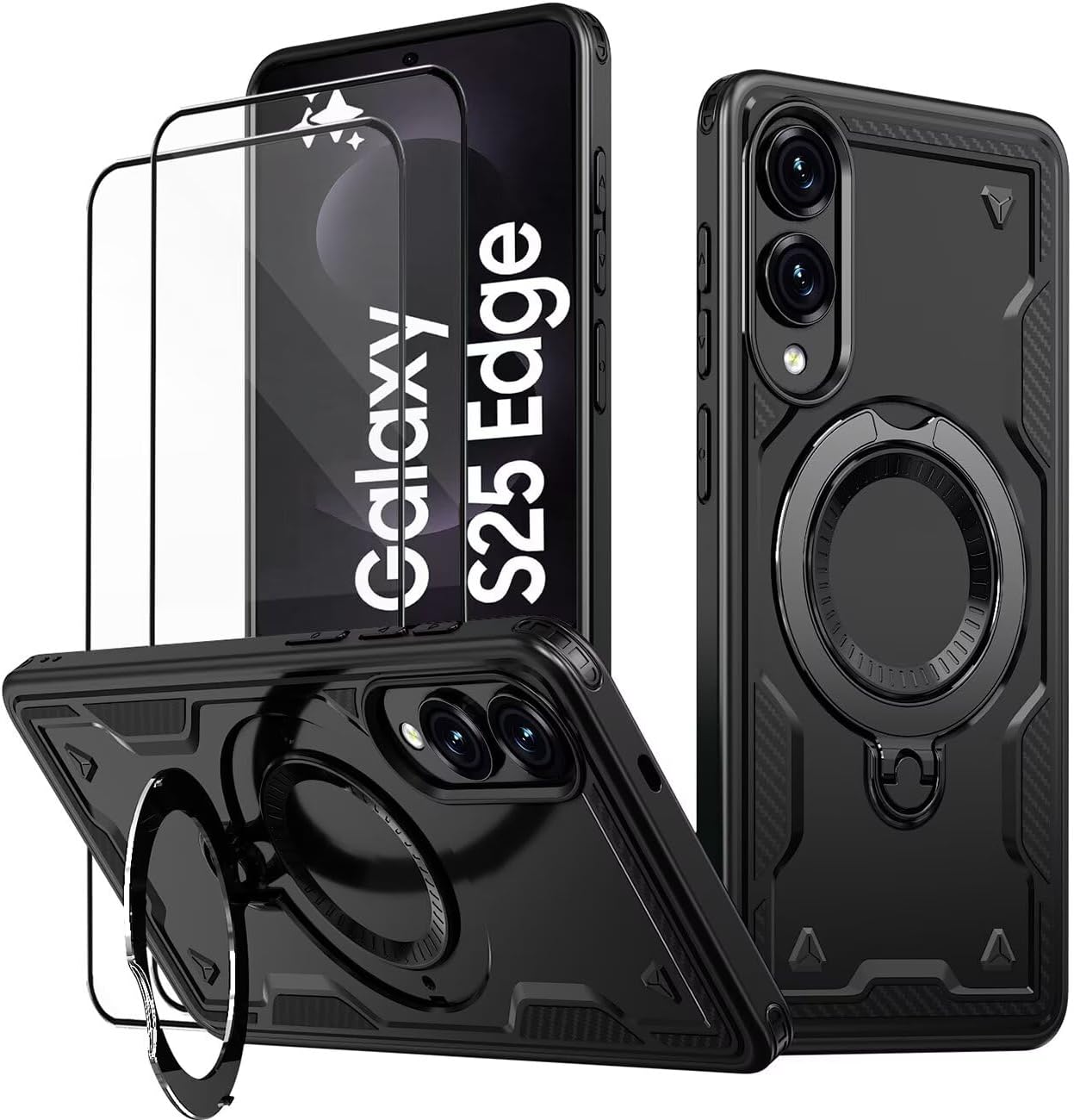 coque Samsung s25 Edge - Coque Samsung Galaxy S25 Edge avec verre trempé 2, coque militaire antichoc avec anneau de téléphone et support - Étuis noirs
