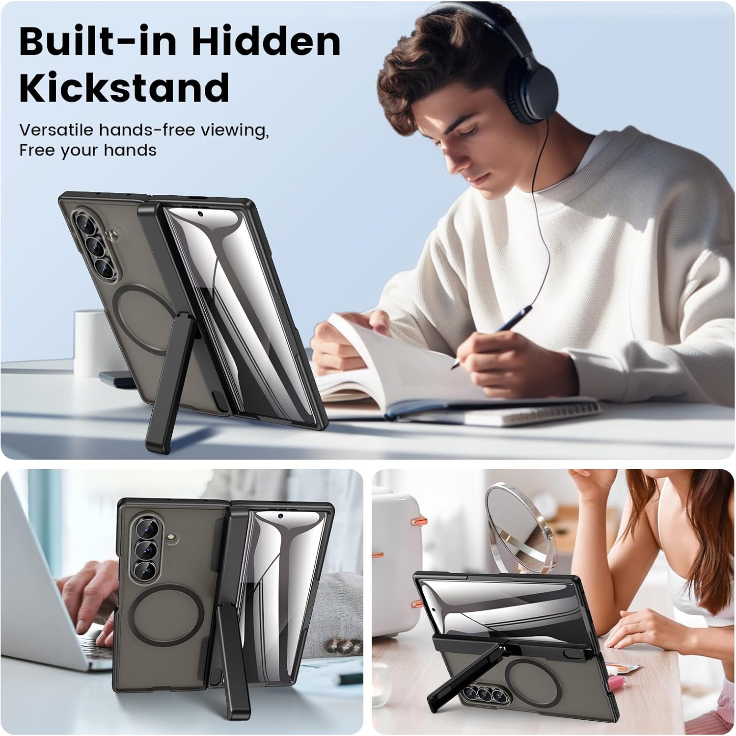 Pied caché – Le pied situé à l’arrière de la coquille Z pli 7 peut être librement ajusté sous plusieurs angles, ce qui facilite l’expérience de mains libres dans des scénarios tels que l’affichage du paysage, la vidéoconférence et la cuisson.