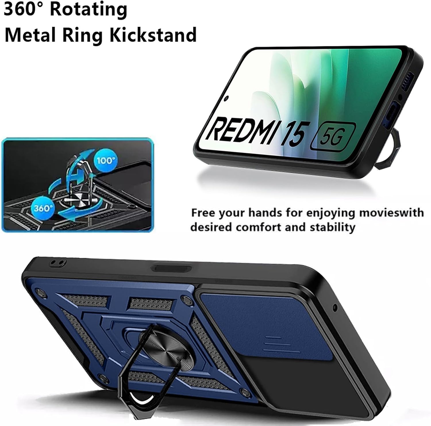 MEMELOKA XIAOMI REDMI 15 4G / 5G avec verre trempé, couvercle de protection militaire anti-rayures + support métallique à 360 ° Case d’amortisseur rotatif, bleu