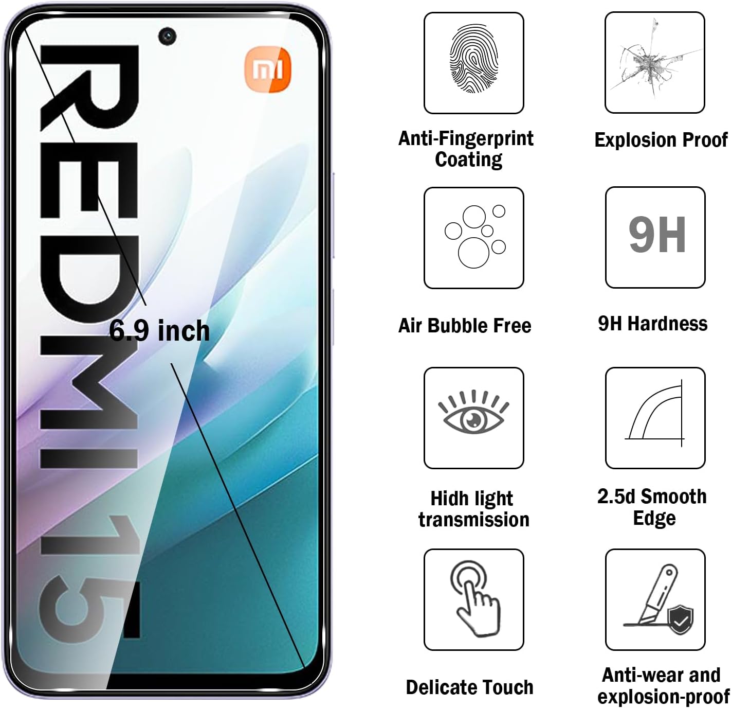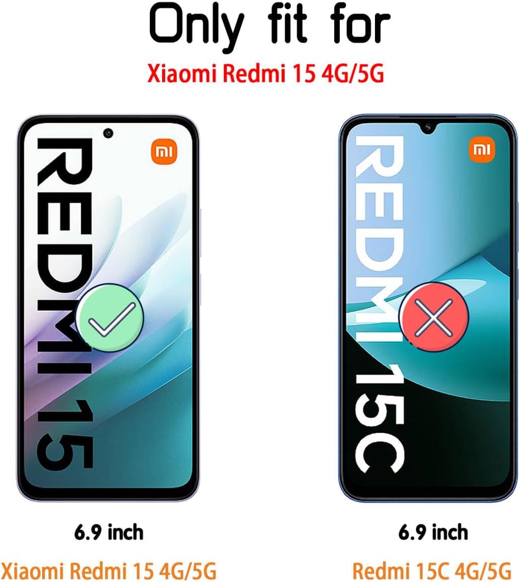 【Ajustement parfait】 2 + 2pcs Protecteur de caméra arrière et protecteurs d’écran en verre trempé HD EXCLUSIVEMENT conçu pour Xiaomi Redmi 15 4G / 5G. Emballage inclus: 2 x protecteur d’écran en verre trempé, 2 x protecteur de caméra arrière, 2 x kits d’accessoires d’installation. Ce protecteur d’écran en verre n’est compatible qu’avec Xiaomi Redmi 15 5G! ! !