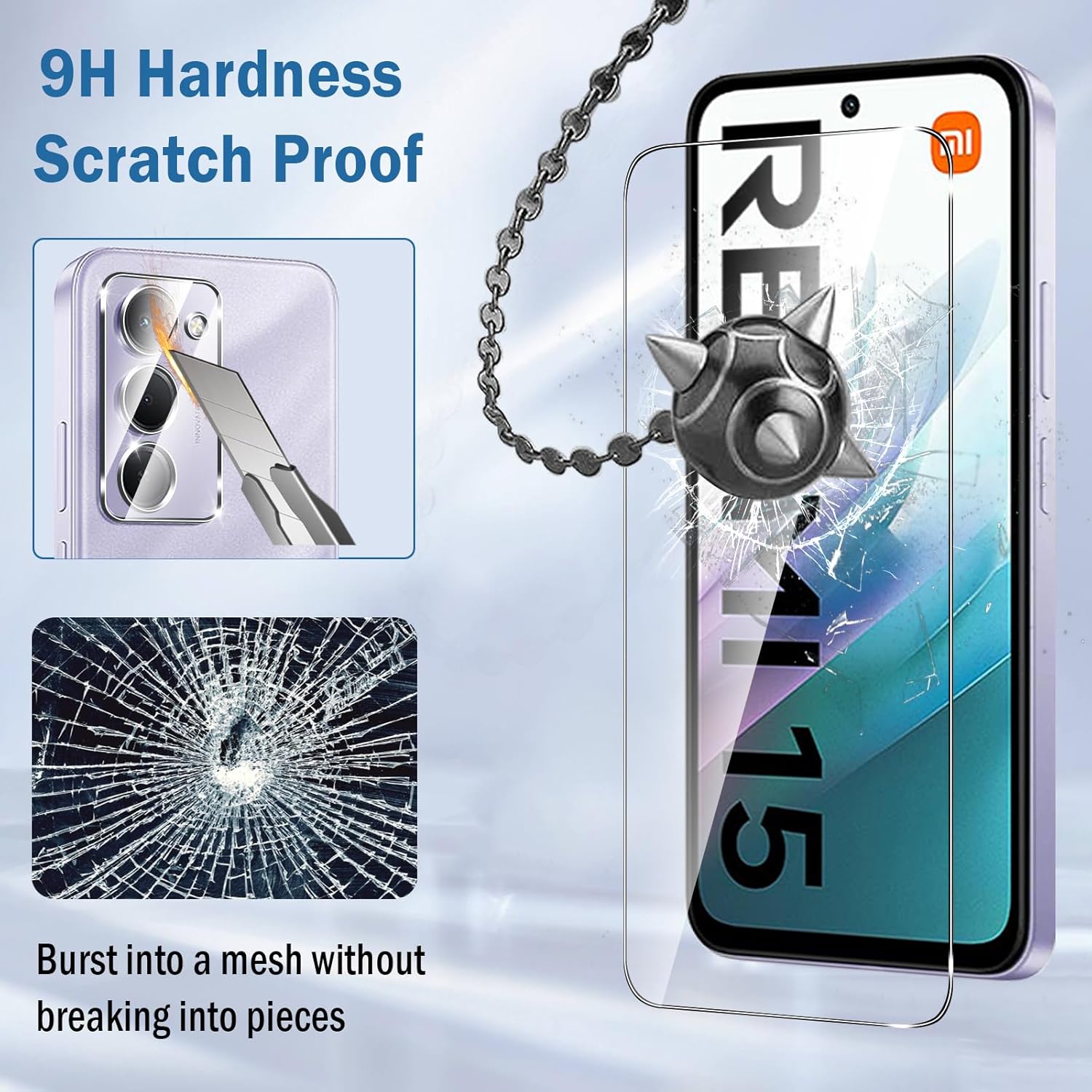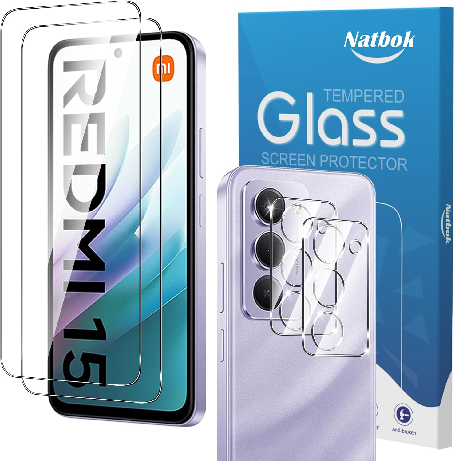Natbok 2 + 2 pièces Verre trempée pour Xiaomi Redmi 15 4G avec 2 protecteur de caméra arrière, (sans bulles) (anti-rayures) Protecteur d’écran pour Redmi 15, verre transparent HD, facile à installer