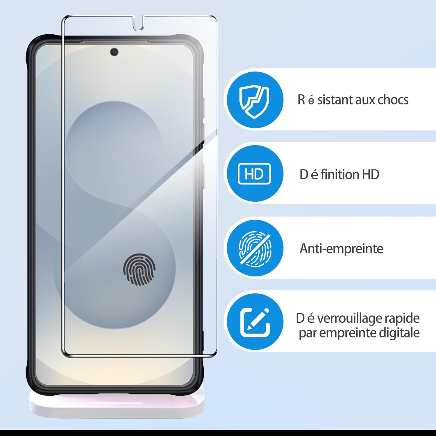 avec dos transparent et coins renforcés. Découpe visible pour deux caméras. Fond bleu avec texte français décrivant l'empreinte numérique et le matériel de qualité.avec dos transparent et coins renforcés. Découpe visible pour deux caméras. Fond bleu avec texte français décrivant l'empreinte numérique et le matériel de qualité.