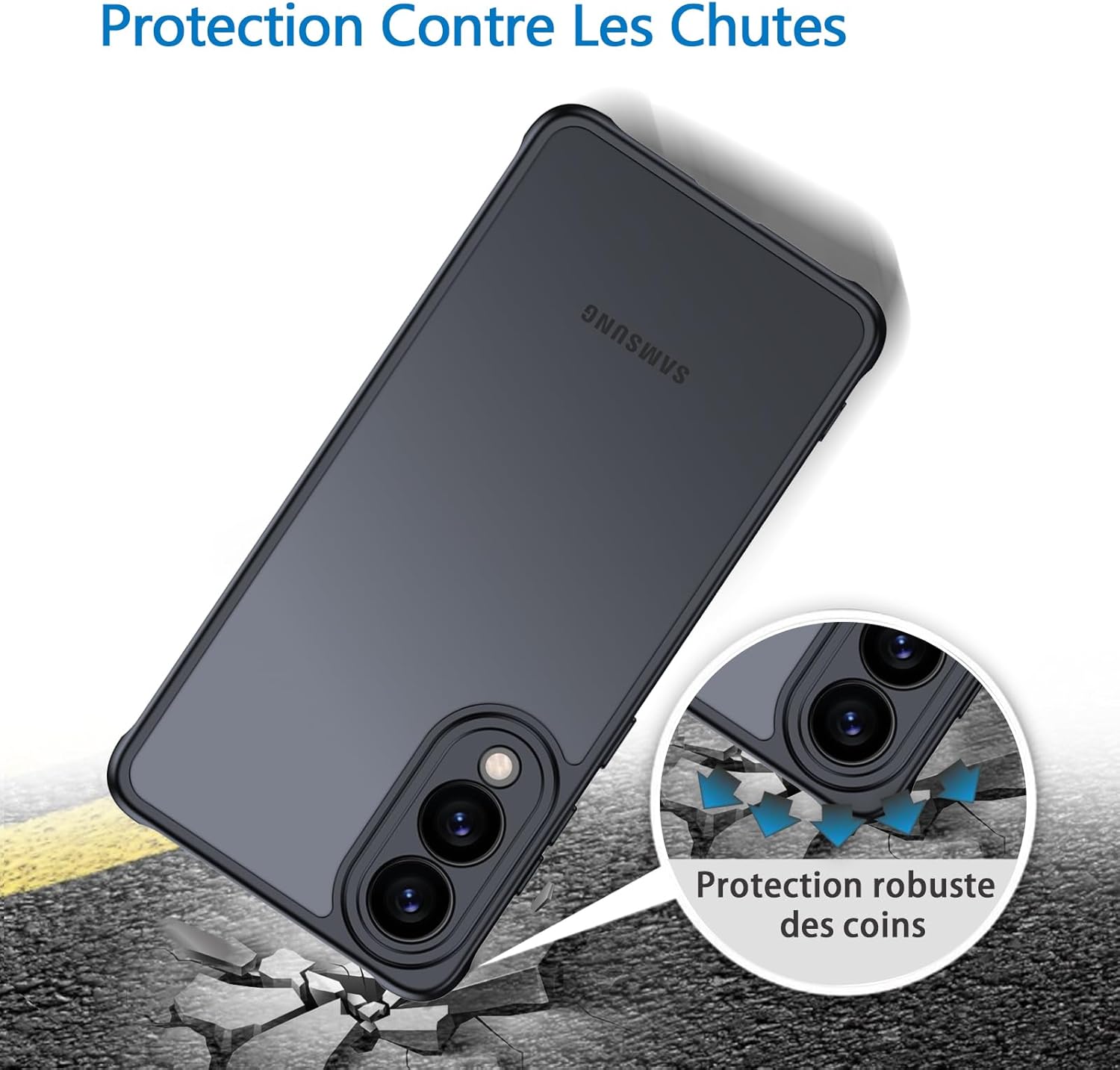 Image à trois panneaux montrant les caractéristiques de protection : un film de verre trempé repoussant les chocs, des airbags d'angle intégrés et une structure de matériau à trois couches. Le texte français indique une protection contre les chutes de niveau militaireImage à trois panneaux montrant les caractéristiques de protection : un film de verre trempé repoussant les chocs, des airbags d'angle intégrés et une structure de matériau à trois couches. Le texte français indique une protection contre les chutes de niveau militaire