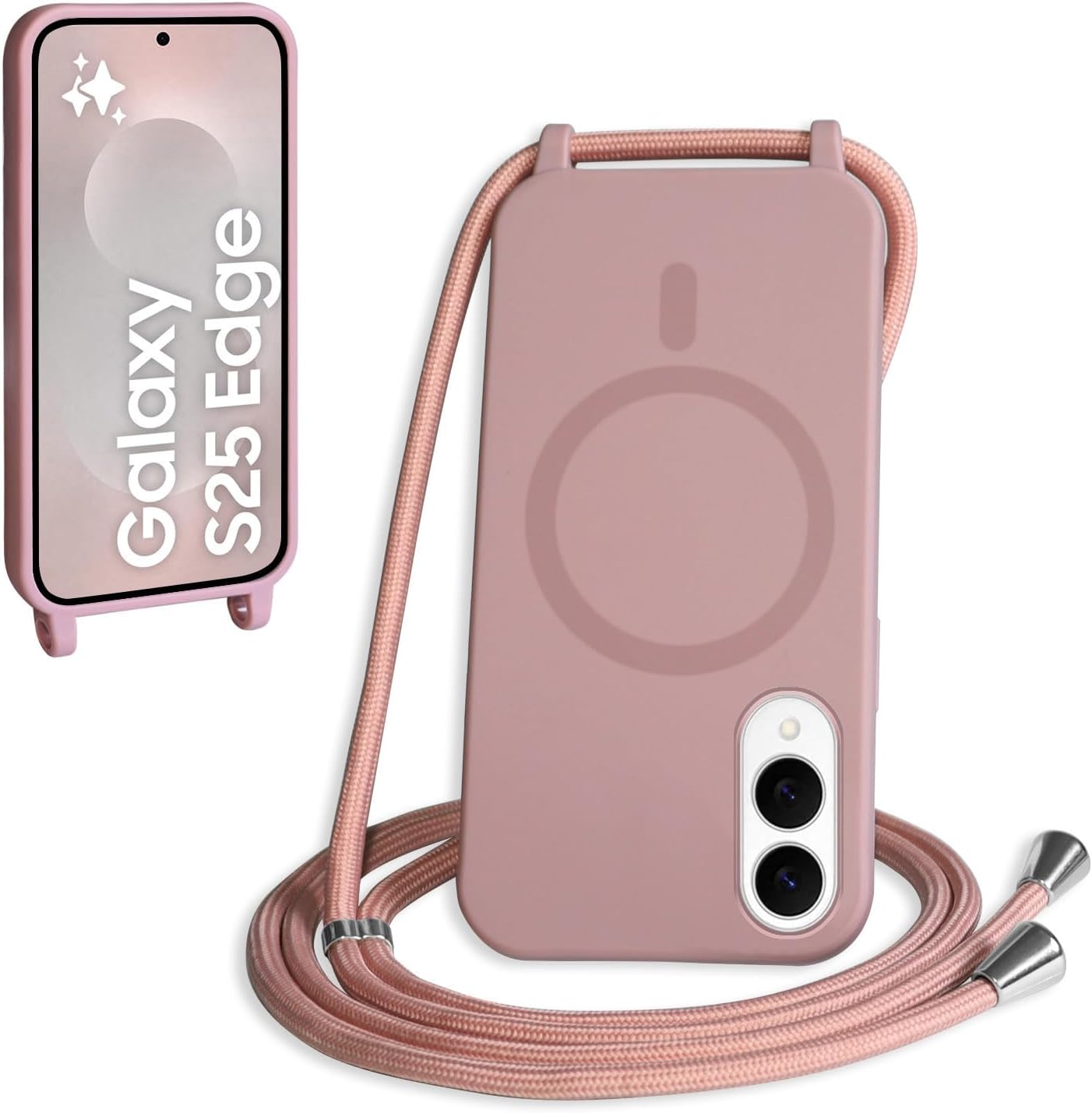 Samsung s25 Edge - FMPCUON Coque magnétique avec cordon pour Samsung Galaxy S25 Edge (compatible avec MagSafe), coque de téléphone réglable avec lanière, coque de protection complète, rose