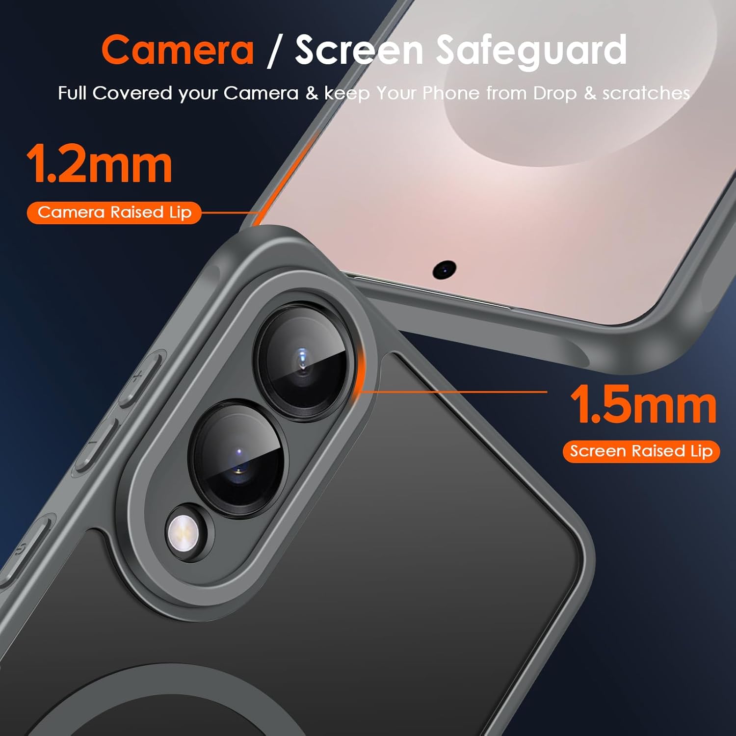 (Protection de l’écran et de la caméra) — Il n’est pas nécessaire d’acheter une protection supplémentaire pour la caméra. Le cadre est 2,5 mm plus haut que l’objectif de l’appareil photo de votre téléphone et offre une protection maximale contre les rayures et les chutes. Couvrant entièrement l’objectif de l’appareil photo, le gardant à l’abri des rayures. Le bord avant surélevé de 1,5 mm entoure l’écran et le protège lorsqu’il est placé face vers le bas.
