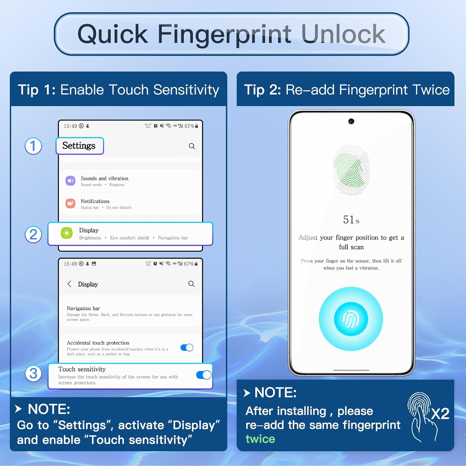 (Déverrouillage par empreinte digitale) Conçu pour Samsung Galaxy S25 Edge. Remarque : ne convient pas pour Samsung Galaxy S25/S25 Plus/S25 Ultra. Pour une meilleure expérience de déverrouillage, veuillez accéder aux paramètres de votre appareil pour activer la sensibilité tactile et ressaisir votre empreinte digitale après avoir appliqué le film.