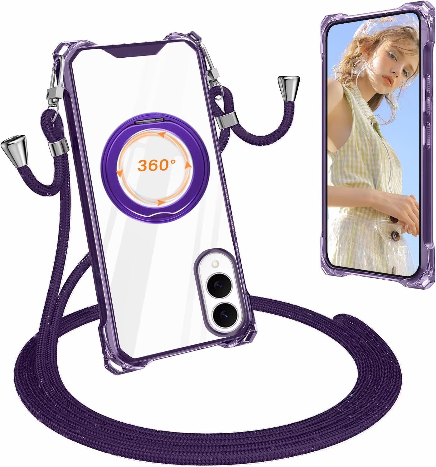 Samsung s25 Edge – xinyunew Coque magnétique pour Samsung Galaxy S25 Edge avec cordon, rotation à 360°, coque transparente avec lanière, fine, souple, en silicone TPU, appareil photo résistant aux chocs, violet